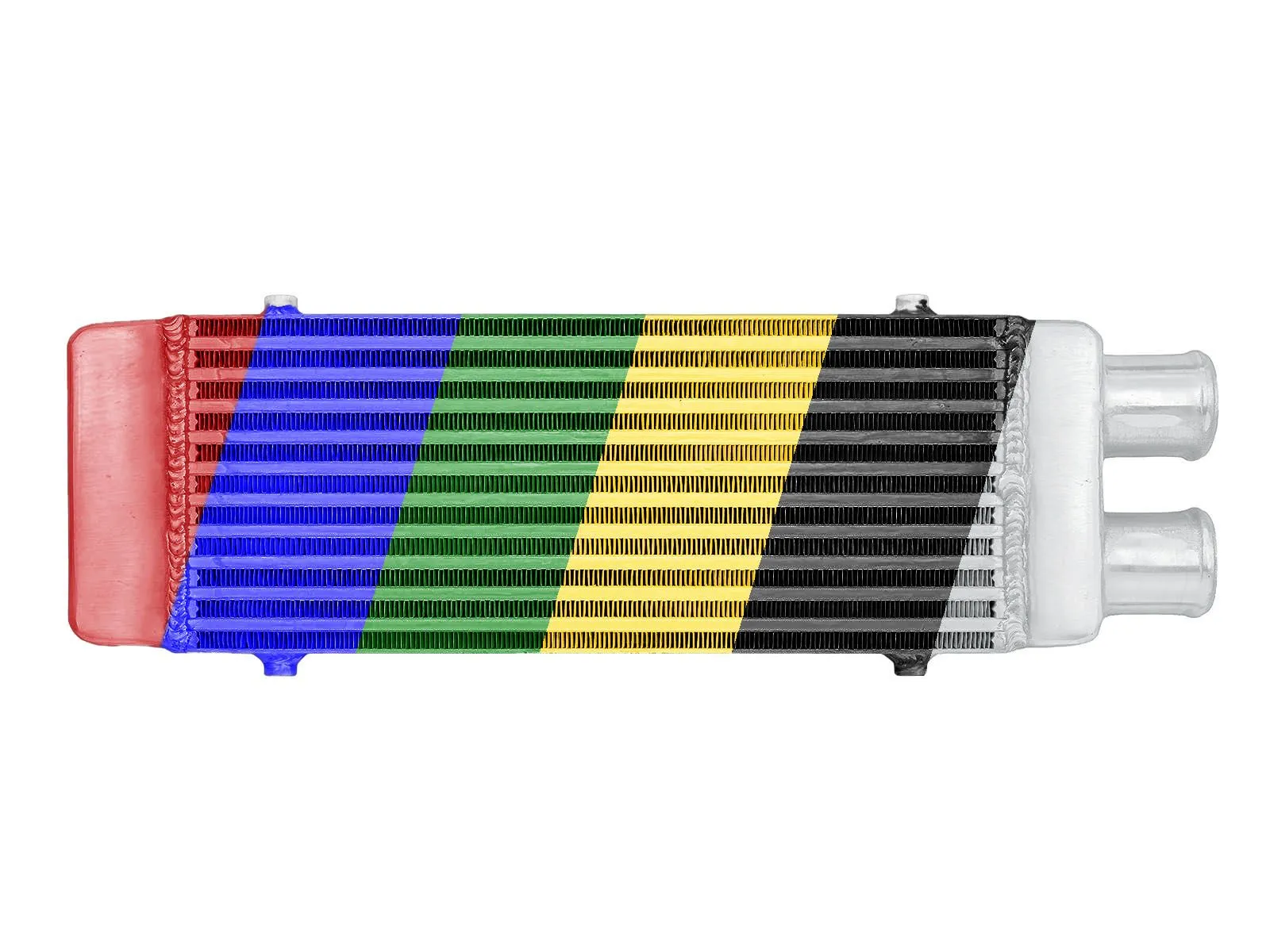 Intercooler o wymiarach rdzenia: 450x180x65mm, wymiary całkowite: 560x180x65mm, przespawane wlot i wylot na jedną stronę o średnicy 63mm, wystarczający do mocy 200KM. Posiada bardzo wydajny rdzeń, grube ścianki wykonane z najwyższej jakości polerowanego aluminium, co gwarantuje ogromną wytrzymałość, świetne chłodzenie, a także doskonałe przepływy powietrza (w przeciwieństwie do intercoolerów z samochodów dostawczych nie "zapychają" dolotu). Znakomicie zastępują seryjne intercoolery zwiększając osiągi samochodu. Świetnie sprawdza się w samochodach mających orurowanie idące z turbo i do kolektora po jednej stronie samochodu. Nasze intercoolery były testowane do 5 barów - nawet tak duże ciśnienie nie robi na nich żadnego wrażenia. Wszystkie sprzedawane na naszych aukcjach intercoolery posiadają nowy, dużo wydajniejszy rdzeń drugiego typu! Stary rdzeń widoczny po prawej stronie miał bardzo rzadko ułożone żeberka, do tego tylko w jednym rzędzie (patrząc przez wlot było widać wylot), co skutkowało słabym chłodzeniem - przelatujące nim powietrze nie oddawało całego ciepła. Oferowane na naszych aukcjach intercoolery posiadają dużo gęstszy, naprzemiennie ułożony radiator, co gwarantuje ogromną poprawę chodzenia! Intercooler jednostronny jest robiony na indywidualne zamówienie. Czas oczekiwania od 1 do 2 dni roboczych!!! Intercooler - Kolor - w wiadomości napisz, jaki ma być kolor.