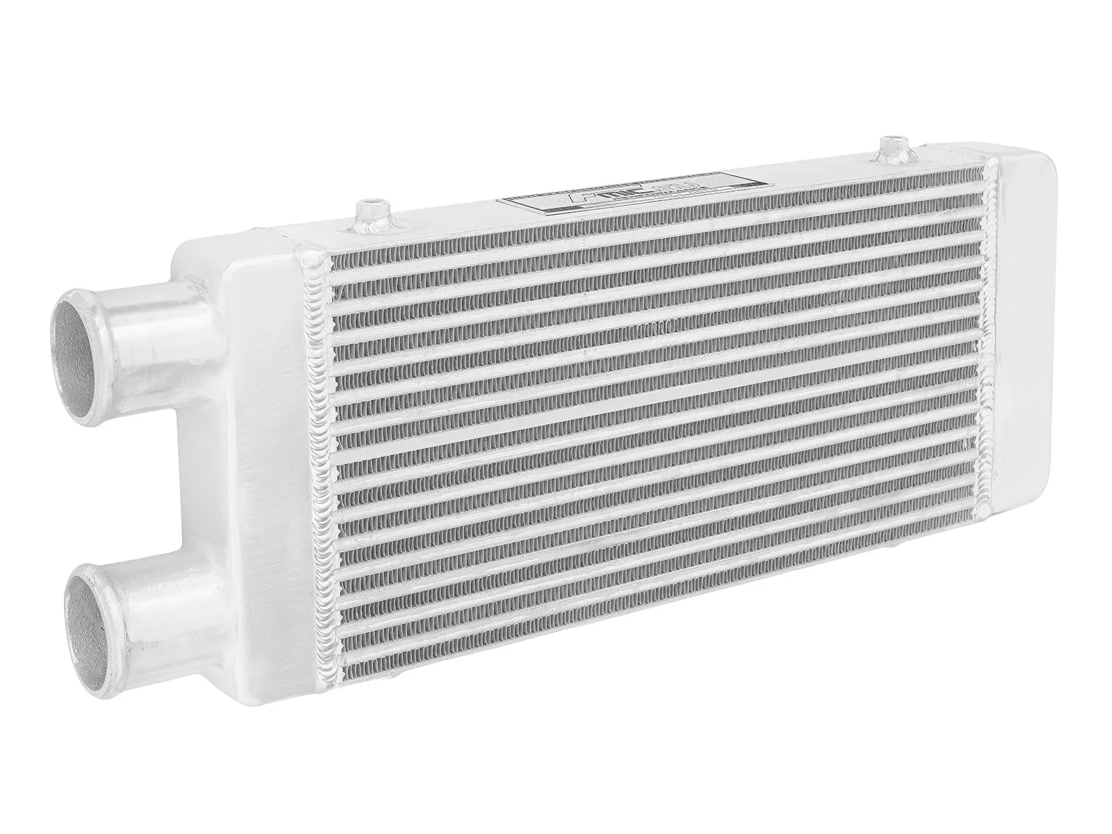 Intercooler o wymiarach rdzenia: 450x230x65mm, całkowite wymiary: 560x230x65mm, przespawany wlot i wylot na jedną stronę o średnicach 63mm, wystarczający do mocy 250KM. Posiada bardzo wydajny rdzeń, grube ścianki wykonane z najwyższej jakości polerowanego aluminium, co gwarantuje ogromną wytrzymałość, świetne chłodzenie, a także doskonałe przepływy powietrza (w przeciwieństwie do intercoolerów z samochodów dostawczych nie "zapychają" dolotu). Znakomicie zastępują seryjne intercoolery zwiększając osiągi samochodu. Świetnie sprawdza się w samochodach mających orurowanie idące z turbo i do kolektora po jednej stronie samochodu. Nasze intercoolery były testowane do 5 barów - nawet tak duże ciśnienie nie robi na nich żadnego wrażenia. Wszystkie sprzedawane na naszych aukcjach intercoolery posiadają nowy, dużo wydajniejszy rdzeń drugiego typu! Stary rdzeń widoczny po prawej stronie miał bardzo rzadko ułożone żeberka, do tego tylko w jednym rzędzie (patrząc przez wlot było widać wylot), co skutkowało słabym chłodzeniem - przelatujące nim powietrze nie oddawało całego ciepła. Oferowane na naszych aukcjach intercoolery posiadają dużo gęstszy, naprzemiennie ułożony radiator, co gwarantuje ogromną poprawę chodzenia! Intercooler jednostronny jest robiony na indywidualne zamówienie. Czas oczekiwania od 1 do 2 dni roboczych!!! Intercooler - FMIC.EU