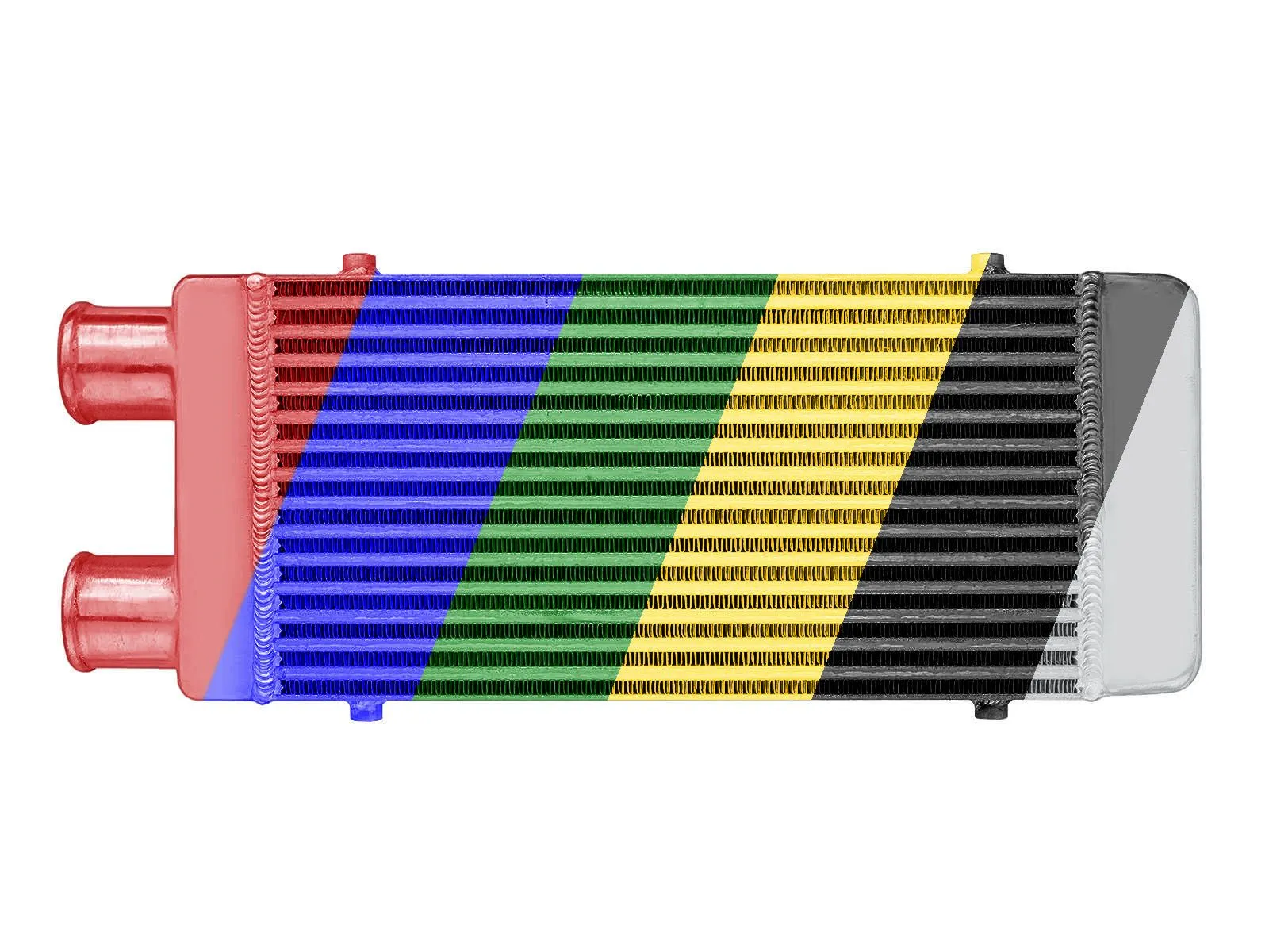 Intercooler o wymiarach rdzenia: 450x230x65mm, całkowite wymiary: 560x230x65mm, przespawany wlot i wylot na jedną stronę o średnicach 63mm, wystarczający do mocy 250KM. Posiada bardzo wydajny rdzeń, grube ścianki wykonane z najwyższej jakości polerowanego aluminium, co gwarantuje ogromną wytrzymałość, świetne chłodzenie, a także doskonałe przepływy powietrza (w przeciwieństwie do intercoolerów z samochodów dostawczych nie "zapychają" dolotu). Znakomicie zastępują seryjne intercoolery zwiększając osiągi samochodu. Świetnie sprawdza się w samochodach mających orurowanie idące z turbo i do kolektora po jednej stronie samochodu. Nasze intercoolery były testowane do 5 barów - nawet tak duże ciśnienie nie robi na nich żadnego wrażenia. Wszystkie sprzedawane na naszych aukcjach intercoolery posiadają nowy, dużo wydajniejszy rdzeń drugiego typu! Stary rdzeń widoczny po prawej stronie miał bardzo rzadko ułożone żeberka, do tego tylko w jednym rzędzie (patrząc przez wlot było widać wylot), co skutkowało słabym chłodzeniem - przelatujące nim powietrze nie oddawało całego ciepła. Oferowane na naszych aukcjach intercoolery posiadają dużo gęstszy, naprzemiennie ułożony radiator, co gwarantuje ogromną poprawę chodzenia! Intercooler jednostronny jest robiony na indywidualne zamówienie. Czas oczekiwania od 1 do 2 dni roboczych!!! Intercooler - Kolor - w wiadomości napisz, jaki ma być kolor.
