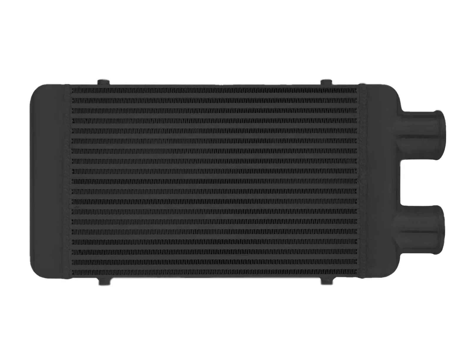 Intercooler o wymiarach rdzenia: 450x300x76mm, wymiar całkowity: 580x300x76mm, przespawany wlot i wylot na jedną stronę o średnicach 76mm, wystarczający do mocy 380KM. Posiada bardzo wydajny rdzeń, grube ścianki wykonane z najwyższej jakości polerowanego aluminium, co gwarantuje ogromną wytrzymałość, świetne chłodzenie, a także doskonałe przepływy powietrza (w przeciwieństwie do intercoolerów z samochodów dostawczych nie "zapychają" dolotu). Znakomicie zastępują seryjne intercoolery zwiększając osiągi samochodu. Świetnie sprawdza się w samochodach mających orurowanie idące z turbo i do kolektora po jednej stronie samochodu. Nasze intercoolery były testowane do 5 barów - nawet tak duże ciśnienie nie robi na nich żadnego wrażenia. Wszystkie sprzedawane na naszych aukcjach intercoolery posiadają nowy, dużo wydajniejszy rdzeń drugiego typu! Stary rdzeń widoczny po prawej stronie miał bardzo rzadko ułożone żeberka, do tego tylko w jednym rzędzie (patrząc przez wlot było widać wylot), co skutkowało słabym chłodzeniem - przelatujące nim powietrze nie oddawało całego ciepła. Oferowane na naszych aukcjach intercoolery posiadają dużo gęstszy, naprzemiennie ułożony radiator, co gwarantuje ogromną poprawę chodzenia! Intercooler jednostronny jest robiony na indywidualne zamówienie. Czas oczekiwania od 1 do 2 dni roboczych!!! Intercooler - czarny