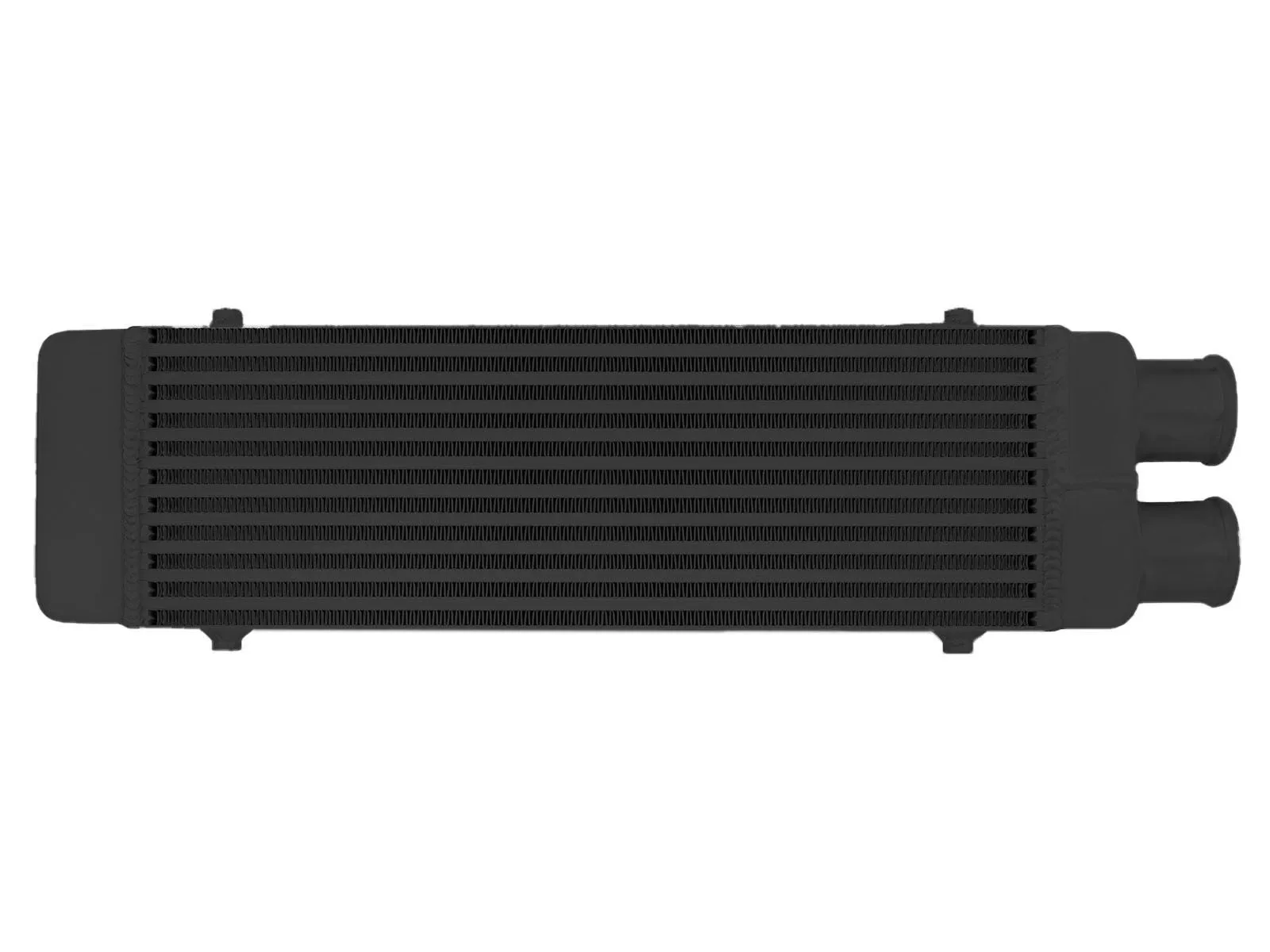 Intercooler o wymiarach rdzenia: 550x180x65mm, wymiary całkowite: 660x180x65mm, przespawane wlot i wylot na jedną stronę o średnicy 57mm, wystarczający do mocy 250KM. Posiada bardzo wydajny rdzeń, grube ścianki wykonane z najwyższej jakości polerowanego aluminium, co gwarantuje ogromną wytrzymałość, świetne chłodzenie, a także doskonałe przepływy powietrza (w przeciwieństwie do intercoolerów z samochodów dostawczych nie "zapychają" dolotu). Znakomicie zastępują seryjne intercoolery zwiększając osiągi samochodu. Świetnie sprawdza się w samochodach mających orurowanie idące z turbo i do kolektora po jednej stronie samochodu, np. Alfa Romeo 147, 156, Fiat Bravo, Brava, Marea itd. Nasze intercoolery były testowane do 5 barów - nawet tak duże ciśnienie nie robi na nich żadnego wrażenia. Wszystkie sprzedawane na naszych aukcjach intercoolery posiadają nowy, dużo wydajniejszy rdzeń drugiego typu! Stary rdzeń widoczny po prawej stronie miał bardzo rzadko ułożone żeberka, do tego tylko w jednym rzędzie (patrząc przez wlot było widać wylot), co skutkowało słabym chłodzeniem - przelatujące nim powietrze nie oddawało całego ciepła. Oferowane na naszych aukcjach intercoolery posiadają dużo gęstszy, naprzemiennie ułożony radiator, co gwarantuje ogromną poprawę chodzenia! Intercooler jednostronny jest robiony na indywidualne zamówienie. Czas oczekiwania od 1 do 2 dni roboczych!!! Intercooler - czarny