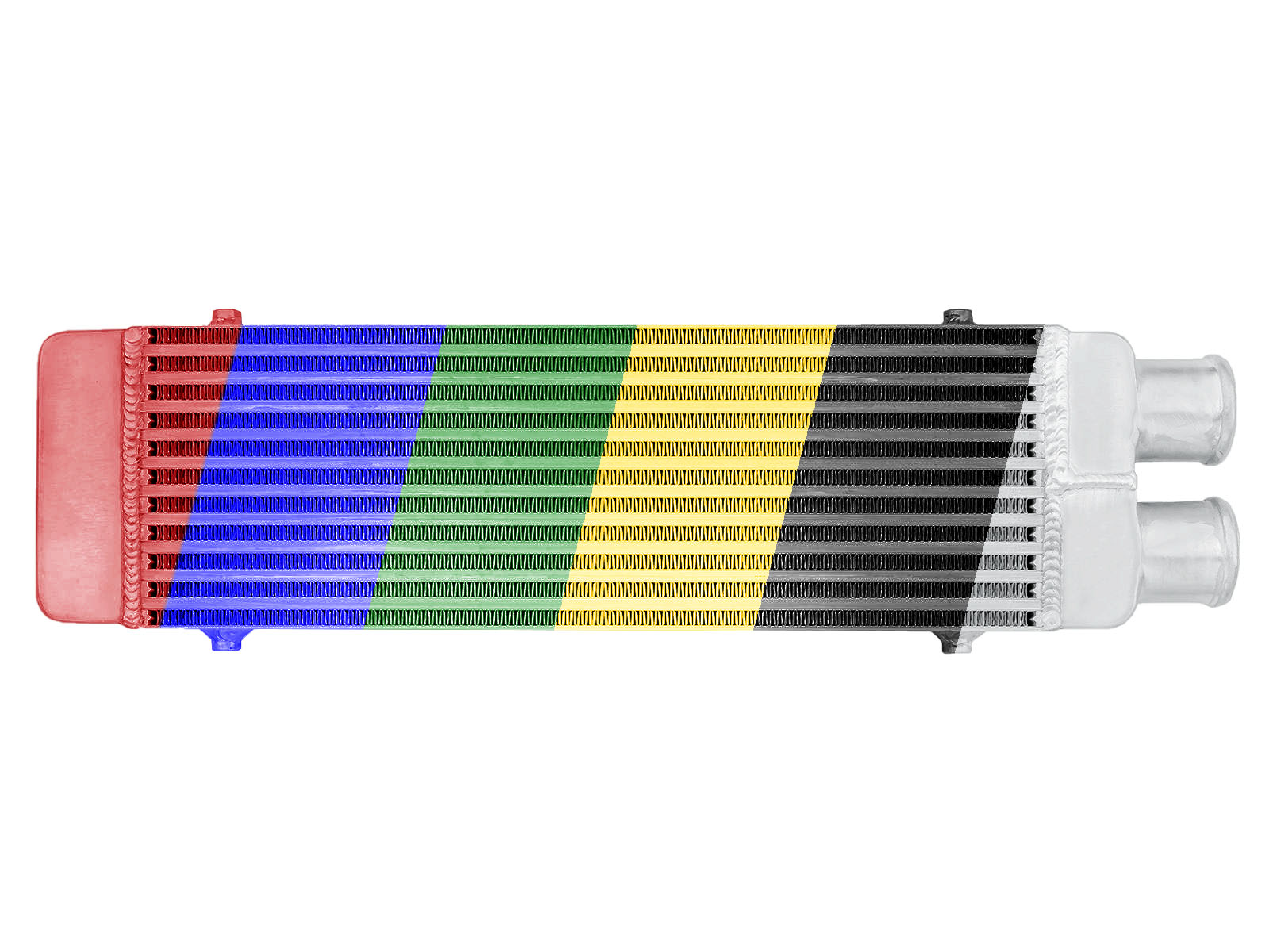 Posiada bardzo wydajny rdzeń, grube ścianki wykonane z najwyższej jakości polerowanego aluminium, co gwarantuje ogromną wytrzymałość, świetne chłodzenie, a także doskonałe przepływy powietrza (w przeciwieństwie do intercoolerów z samochodów dostawczych nie "zapychają" dolotu). Znakomicie zastępują seryjne intercoolery zwiększając osiągi samochodu. Świetnie sprawdza się w samochodach mających orurowanie idące z turbo i do kolektora po jednej stronie samochodu, np. Alfa Romeo 147, 156, Fiat Bravo, Brava, Marea itd. Nasze intercoolery były testowane do 5 barów - nawet tak duże ciśnienie nie robi na nich żadnego wrażenia. Wszystkie sprzedawane na naszych aukcjach intercoolery posiadają nowy, dużo wydajniejszy rdzeń drugiego typu! Stary rdzeń widoczny po prawej stronie miał bardzo rzadko ułożone żeberka, do tego tylko w jednym rzędzie (patrząc przez wlot było widać wylot), co skutkowało słabym chłodzeniem - przelatujące nim powietrze nie oddawało całego ciepła. Oferowane na naszych aukcjach intercoolery posiadają dużo gęstszy, naprzemiennie ułożony radiator, co gwarantuje ogromną poprawę chodzenia!
