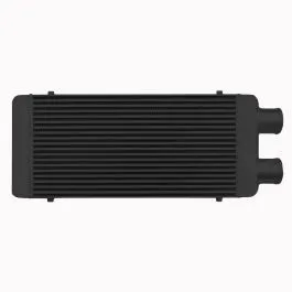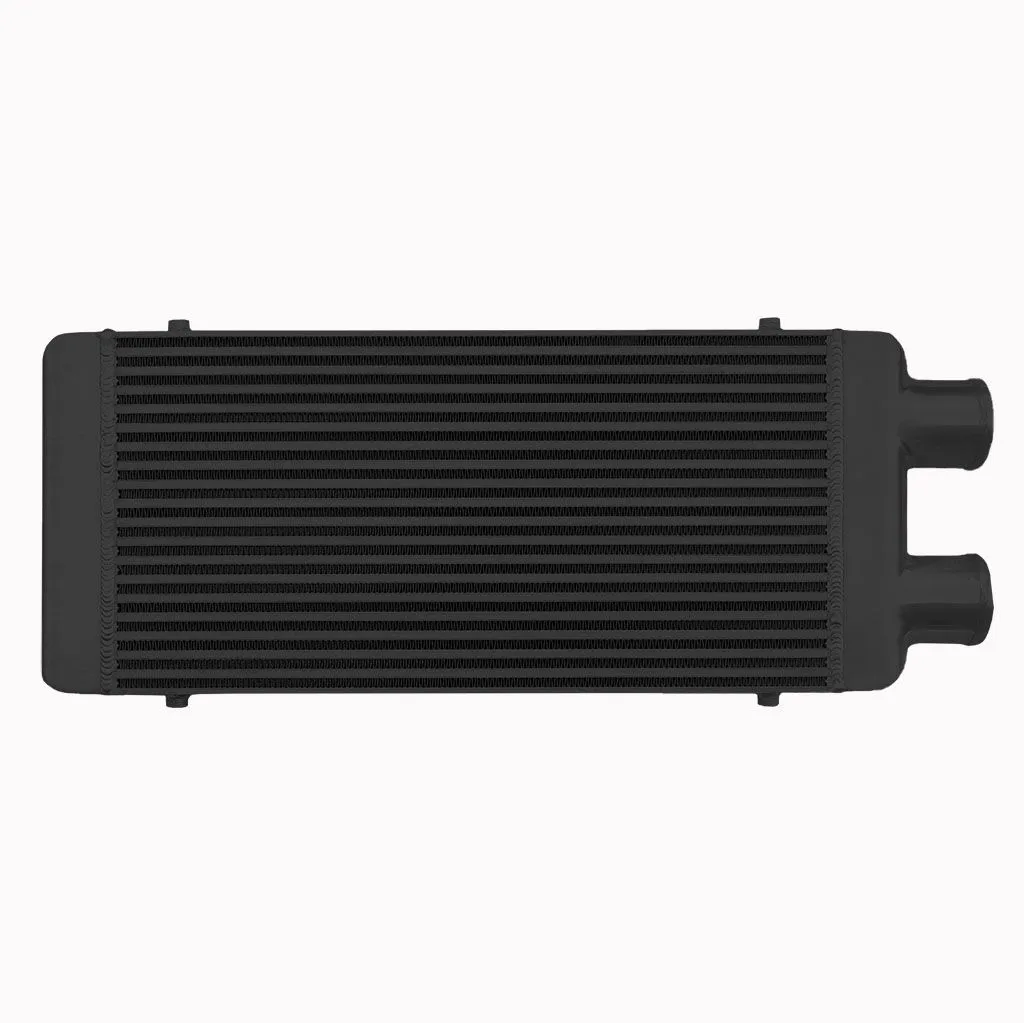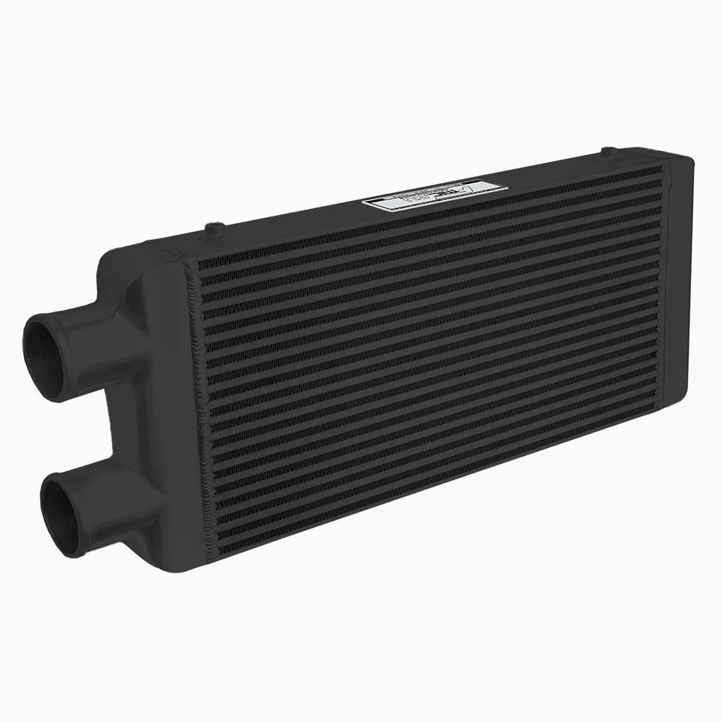 Intercooler o wymiarach rdzenia: 600x300x100mm, wymiar całkowity: 730x300x100mm, przespawany wlot i wylot na jedną stronę o średnicach 76mm, wystarczający do mocy 650KM. Posiada bardzo wydajny rdzeń, grube ścianki wykonane z najwyższej jakości polerowanego aluminium, co gwarantuje ogromną wytrzymałość, świetne chłodzenie, a także doskonałe przepływy powietrza (w przeciwieństwie do intercoolerów z samochodów dostawczych nie "zapychają" dolotu). Znakomicie zastępują seryjne intercoolery zwiększając osiągi samochodu. Świetnie sprawdza się w samochodach mających orurowanie idące z turbo i do kolektora po jednej stronie samochodu. Nasze intercoolery były testowane do 5 barów - nawet tak duże ciśnienie nie robi na nich żadnego wrażenia. Wszystkie sprzedawane na naszych aukcjach intercoolery posiadają nowy, dużo wydajniejszy rdzeń drugiego typu! Stary rdzeń widoczny po prawej stronie miał bardzo rzadko ułożone żeberka, do tego tylko w jednym rzędzie (patrząc przez wlot było widać wylot), co skutkowało słabym chłodzeniem - przelatujące nim powietrze nie oddawało całego ciepła. Oferowane na naszych aukcjach intercoolery posiadają dużo gęstszy, naprzemiennie ułożony radiator, co gwarantuje ogromną poprawę chodzenia! Intercooler jednostronny jest robiony na indywidualne zamówienie. Czas oczekiwania od 1 do 2 dni roboczych!!! Kolor - Czarny Intercooler - FMIC.EU