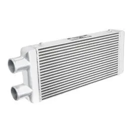 Intercooler o wymiarach rdzenia: 600x300x100mm, wymiar całkowity: 730x300x100mm, przespawany wlot i wylot na jedną stronę o średnicach 76mm, wystarczający do mocy 650KM. Posiada bardzo wydajny rdzeń, grube ścianki wykonane z najwyższej jakości polerowanego aluminium, co gwarantuje ogromną wytrzymałość, świetne chłodzenie, a także doskonałe przepływy powietrza (w przeciwieństwie do intercoolerów z samochodów dostawczych nie "zapychają" dolotu). Znakomicie zastępują seryjne intercoolery zwiększając osiągi samochodu. Świetnie sprawdza się w samochodach mających orurowanie idące z turbo i do kolektora po jednej stronie samochodu. Nasze intercoolery były testowane do 5 barów - nawet tak duże ciśnienie nie robi na nich żadnego wrażenia. Wszystkie sprzedawane na naszych aukcjach intercoolery posiadają nowy, dużo wydajniejszy rdzeń drugiego typu! Stary rdzeń widoczny po prawej stronie miał bardzo rzadko ułożone żeberka, do tego tylko w jednym rzędzie (patrząc przez wlot było widać wylot), co skutkowało słabym chłodzeniem - przelatujące nim powietrze nie oddawało całego ciepła. Oferowane na naszych aukcjach intercoolery posiadają dużo gęstszy, naprzemiennie ułożony radiator, co gwarantuje ogromną poprawę chodzenia! Intercooler jednostronny jest robiony na indywidualne zamówienie. Czas oczekiwania od 1 do 2 dni roboczych!!! Intercooler - FMIC.EU
