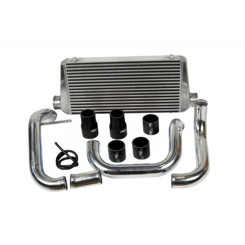 Zestaw dedykowany do Nissana Skyline R33 złożony jest z odpowiednio dociętych i wyprofilowanych rur oraz kolanek silikonowych i aluminiowych, intercooler posiada mocowania do karoserii. Zestaw zawiera wszystkie części niezbędne do prawidłowego montażu intercoolera w samochodzie. Zalecany montaż w warsztacie tuningowym. Intercooler o wymiarach rdzenia: 600x300x76mm, całkowitych: 780x300x76mm, ze średnicą wlot/wylot 76mm, wystarczający do mocy 900KM. Posiada bardzo wydajny rdzeń, grube ścianki wykonane z najwyższej jakości polerowanego aluminium, co gwarantuje ogromną wytrzymałość, świetne chłodzenie, a także doskonałe przepływy powietrza (w przeciwieństwie do intercoolerów z samochodów dostawczych nie "zapychają" dolotu). Znakomicie zastępuje seryjny intercooler zwiększając osiągi samochodu. Nasze intercoolery jedyne na Allegro były testowane do 5 barów - nawet tak duże ciśnienie nie robi na nich żadnego wrażenia. W przeciwieństwie do podobnych intercoolerów z Allegro, wszystkie sprzedawane na naszych aukcjach chłodnice posiadają nowy, dużo wydajniejszy rdzeń drugiego typu! Stary rdzeń widoczny po prawej stronie miał bardzo rzadko ułożone żeberka, do tego tylko w jednym rzędzie (patrząc przez wlot było widać wylot), co skutkowało słabym chłodzeniem - przelatujące nim powietrze nie oddawało całego ciepła. Oferowane na naszych aukcjach intercoolery posiadają dużo gęstszy, naprzemiennie ułożony radiator, co gwarantuje ogromną poprawę chłodzenia! Oprócz tego widoczny wyżej zewnętrzny radiator ma dodatkowo nacinane (wentylowane) żeberka, dzięki czemu znacznie szybciej oddaje swoje ciepło.Kolor - Czarny