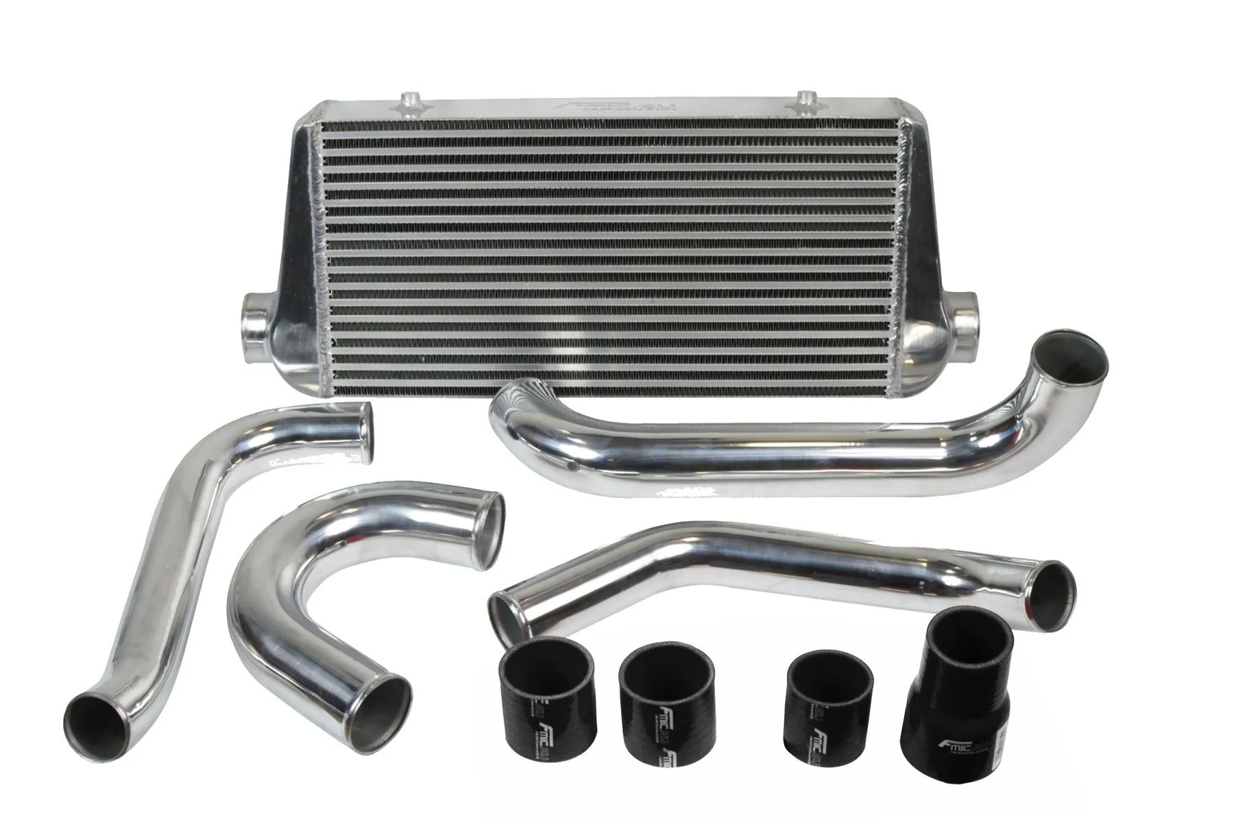 Zestaw dedykowany do Toyoty Supry MK4 złożony jest z odpowiednio dociętych i wyprofilowanych rur oraz kolanek silikonowych i aluminiowych, intercooler posiada mocowania do karoserii. Zestaw zawiera wszystkie części niezbędne do prawidłowego montażu intercoolera w samochodzie. Zalecany montaż w warsztacie tuningowym. Intercooler o wymiarach rdzenia: 600x300x76mm, całkowitych: 780x300x76mm, ze średnicą wlot/wylot 76mm, wystarczający do mocy 900KM. Posiada bardzo wydajny rdzeń, grube ścianki wykonane z najwyższej jakości polerowanego aluminium, co gwarantuje ogromną wytrzymałość, świetne chłodzenie, a także doskonałe przepływy powietrza (w przeciwieństwie do intercoolerów z samochodów dostawczych nie "zapychają" dolotu). Znakomicie zastępuje seryjny intercooler zwiększając osiągi samochodu. Nasze intercoolery jedyne na Allegro były testowane do 5 barów - nawet tak duże ciśnienie nie robi na nich żadnego wrażenia. W przeciwieństwie do podobnych intercoolerów z Allegro, wszystkie sprzedawane na naszych aukcjach chłodnice posiadają nowy, dużo wydajniejszy rdzeń drugiego typu! Stary rdzeń widoczny po prawej stronie miał bardzo rzadko ułożone żeberka, do tego tylko w jednym rzędzie (patrząc przez wlot było widać wylot), co skutkowało słabym chłodzeniem - przelatujące nim powietrze nie oddawało całego ciepła. Oferowane na naszych aukcjach intercoolery posiadają dużo gęstszy, naprzemiennie ułożony radiator, co gwarantuje ogromną poprawę chłodzenia! Oprócz tego widoczny wyżej zewnętrzny radiator ma dodatkowo nacinane (wentylowane) żeberka, dzięki czemu znacznie szybciej oddaje swoje ciepło. PASUJE DO WERSJI TWIN TURBO Kolor - Czarny