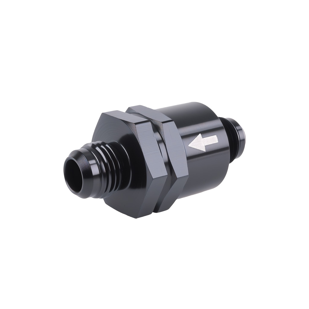 Jednokierunkowy zawór zwrotny AN6 czarny Jednokierunkowy zawór zwrotny AN6 przeznaczony do montażu w układach paliwowych, olejowych lub chłodzenia, w których ciecz ma przepływać tylko w jednym kierunku. Zawór wyposażony jest w męskie przyłącza AN6 po obu stronach (wlot i wylot), co pozwala na łatwą integrację z przewodami w standardzie AN oraz złączkami typu flare. Korpus zaworu wykonany jest z anodowanego aluminium, co gwarantuje lekkość, wysoką odporność na korozję i paliwa. Wewnątrz zastosowano tłok sprężynowy ze stali nierdzewnej oraz uszczelnienia, które zapewniają trwałość i pełną szczelność nawet przy wysokich ciśnieniach i temperaturach. Cechy produktu: -Wyposażony w męskie przyłącza AN6 (wlot i wylot) -Przepuszcza medium tylko w jednym kierunku – idealny do zabezpieczenia układów paliwowych, olejowych lub chłodzenia -Wykonany z wysokiej jakości aluminium anodowanego – odporny na korozję i działanie paliw -Wewnętrzny tłok ze stali nierdzewnej zapewnia płynny przepływ i szybkie zamykanie-Kompaktowa i lekka konstrukcja – łatwy montaż w dowolnej pozycji -Dostępny w kolorach: czarny, niebieski, czerwony Specyfikacja techniczna: -Rozmiar przyłączy: AN6 (męskie z obu stron) -Typ zaworu: tłok sprężynowy -Materiał korpusu: anodowane aluminium -Materiał tłoka: stal nierdzewna -Materiał sprężyny: stal nierdzewna-Kierunek przepływu: oznaczony laserowo na obudowie