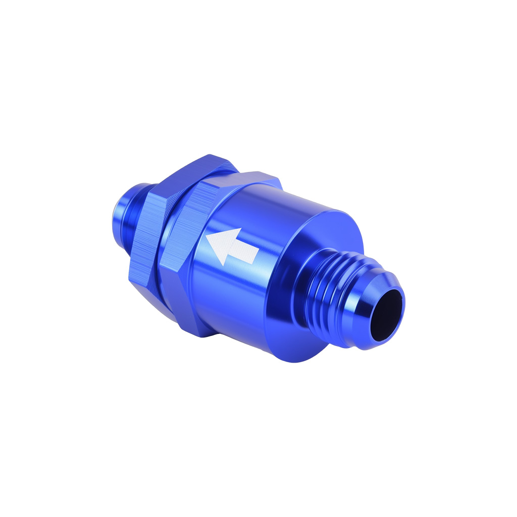 Jednokierunkowy zawór zwrotny AN6 niebieski Jednokierunkowy zawór zwrotny AN6 przeznaczony do montażu w układach paliwowych, olejowych lub chłodzenia, w których ciecz ma przepływać tylko w jednym kierunku. Zawór wyposażony jest w męskie przyłącza AN6 po obu stronach (wlot i wylot), co pozwala na łatwą integrację z przewodami w standardzie AN oraz złączkami typu flare. Korpus zaworu wykonany jest z anodowanego aluminium, co gwarantuje lekkość, wysoką odporność na korozję i paliwa. Wewnątrz zastosowano tłok sprężynowy ze stali nierdzewnej oraz uszczelnienia, które zapewniają trwałość i pełną szczelność nawet przy wysokich ciśnieniach i temperaturach. Cechy produktu: -Wyposażony w męskie przyłącza AN6 (wlot i wylot) -Przepuszcza medium tylko w jednym kierunku – idealny do zabezpieczenia układów paliwowych, olejowych lub chłodzenia -Wykonany z wysokiej jakości aluminium anodowanego – odporny na korozję i działanie paliw -Wewnętrzny tłok ze stali nierdzewnej zapewnia płynny przepływ i szybkie zamykanie-Kompaktowa i lekka konstrukcja – łatwy montaż w dowolnej pozycji -Dostępny w kolorach: czarny, niebieski, czerwony Specyfikacja techniczna: -Rozmiar przyłączy: AN6 (męskie z obu stron) -Typ zaworu: tłok sprężynowy -Materiał korpusu: anodowane aluminium -Materiał tłoka: stal nierdzewna -Materiał sprężyny: stal nierdzewna-Kierunek przepływu: oznaczony laserowo na obudowie