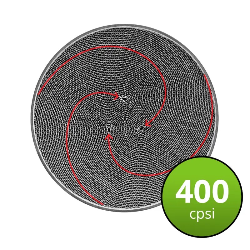 Uniwersalny katalizator ze stali nierdzewnej S409 z metalowym wkładem typu S z 3 rdzeniami dla zwiększenia wydajności i trwałości. Kompatybilny z silnikami benzynowymi oraz instalacjami LPG. Zamontowane równolegle obsługują pojemność silnika do 5 litrów. Stała wytrzymałość na temperaturę 950 °C Chwilowa wytrzymałość na temperaturę 1100 °C Katalizator w zależności od wybranej konfiguracji spełnia wymogi dyrektywy europejskiej: Dyrektywa EURO 2 94/12/WE, 96/69/WE dla samochodów osobowych, obowiązująca od 1996 r. Dyrektywa EURO 3 98/69/WE [12] dla wszystkich pojazdów, obowiązująca od 2000 r. Dyrektywa EURO 4 98/69/WE, 2002/80/WE dla wszystkich pojazdów, obowiązująca od 2005 r. Dyrektywa EURO 5 2007/715/WE[13] dla lekkich samochodów osobowych i firmowych. Obowiązuje od 2009 r. EURO 6 Rozporządzenie Komisji (UE) nr 459/2012. Obowiązuje od 2014 r. Średnica rury dolotowej: 63,5 mm Zastosowanie katalizatora: Benzyna Typ wkładu: Standardowy Materiał wkładu: Metalowy - typ S Producent: RFC Długość całkowita: 310 mm Średnica katalizatora: 112 mm Pojemność silnika: 0.7-2.5L Kształt katalizatora: okrągły