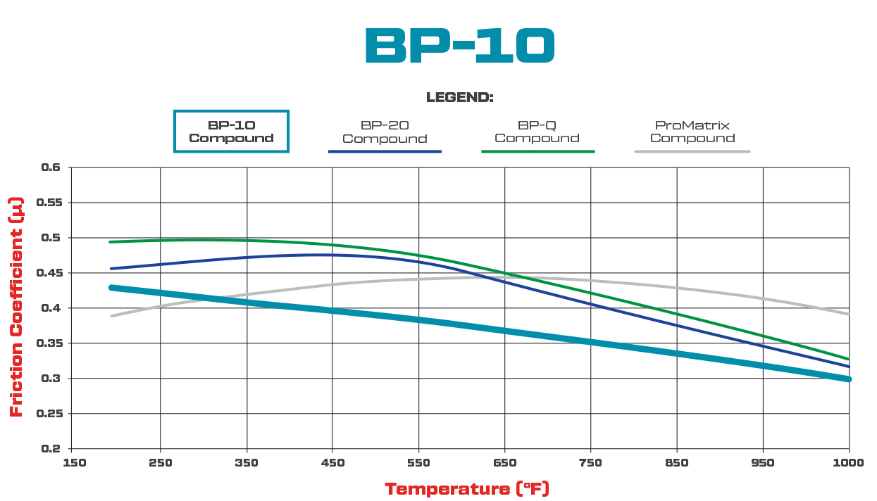Klocki hamulcowe BP-10 (Street Performance / Racing Pads) Pad#: D1792 Mieszanka: BP-10 Charakterystyka produktu Klocki hamulcowe BP-10 to wysokowydajne klocki przeznaczone do jazdy ulicznej i sportowej, łączące doskonałą skuteczność hamowania z komfortem użytkowania. Posiadają średni współczynnik tarcia oraz płynne i przewidywalne działanie, zapewniające pewne hamowanie w różnych warunkach. Klocki te wyróżniają się niskim poziomem hałasu, niskim pyleniem oraz zredukowanym zużyciem w porównaniu ze standardowymi zamiennikami OEM. Cechy mieszanki BP-10: Średni współczynnik tarcia Płynna i progresywna reakcja na nacisk pedału Niskie zużycie na tarczach żeliwnych Cicha praca i ograniczone pylenie Lepsze osiągi i trwałość w porównaniu do klocków seryjnych Zastosowanie Jazda uliczna (Street use okay) Samochody typu muscle car Drag race Lekkie i średnie hamowanie na nawierzchniach dirt (m.in. late models i modified) Materiał tarczy (Rotor Material) Stal Żeliwo Wymiary klocka (Pad Dimensions) Grubość (in): 0.60 Powierzchnia (in²): 15.9 Objętość (in³): 7.66 Wstępnie dotarte (Bedded): Nie Pylenie i hałas (Dust & Noise Ratings) Poziom pylenia: Niski Poziom hałasu: Niski Uwagi dotyczące doboru mieszanki Przy wyborze klocków hamulcowych należy uwzględnić zakres temperatur pracy oraz wartość współczynnika tarcia. W przypadku zastosowań asfaltowych i torowych zalecane są mieszanki o odporności powyżej 1000°F (538°C), natomiast aplikacje typu dirt, drag race oraz street performance funkcjonują zazwyczaj w zakresie 500–1000°F (260–538°C). Jeśli wystąpi utrata skuteczności (fade) spowodowana przegrzaniem, należy rozważyć lepsze chłodzenie, zastosowanie cięższej tarczy lub mieszanki o wyższej odporności cieplnej.