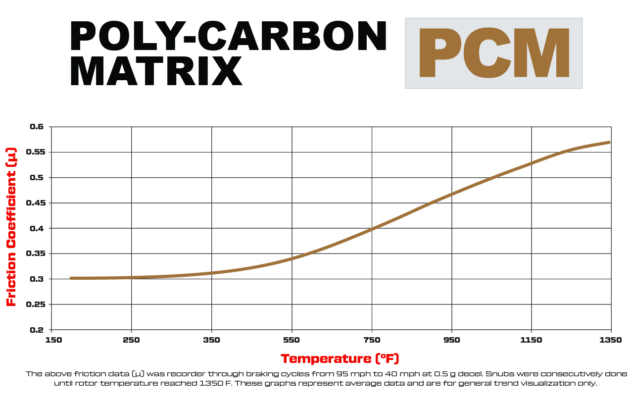 Klocki hamulcowe PCM (Street Performance / Racing Pads) Pad#: D1792 Mieszanka: PCM Charakterystyka produktu Klocki hamulcowe PCM to wysokowydajne klocki przeznaczone do sportowych zastosowań ulicznych, wyścigów na 1/4 mili (drag race) oraz track day. Zaprojektowane z mieszanki o średnim do średnio-wysokiego współczynniku tarcia, zapewniają doskonałą skuteczność hamowania i stabilną charakterystykę pracy nawet w wysokich temperaturach. Idealnie współpracują z wentylowanymi tarczami węglowo-ceramicznymi, oferując pewne wyczucie pedału i niskie zużycie materiału przy zachowaniu doskonałej kontroli modulacji siły hamowania. Cechy mieszanki PCM: Średni do średnio-wysokiego współczynnika tarcia Stabilna skuteczność w szerokim zakresie temperatur Doskonała współpraca z tarczami węglowo-ceramicznymi Przeznaczone do sportowej jazdy ulicznej, drag race oraz torowej Zastosowanie Wysokowydajna jazda uliczna Drag race Track day Wymiary klocka (Pad Dimensions) Grubość (in): 0.60 Powierzchnia (in²): 15.9 Objętość (in³): 7.66 Wstępnie dotarte (Bedded): Nie Pylenie i hałas (Dust & Noise Ratings) Poziom pylenia: Niski Poziom hałasu: Niski Uwagi dotyczące doboru mieszanki Dobór odpowiednich klocków zależy od zakresu temperatur pracy oraz wartości współczynnika tarcia. W przypadku zastosowań asfaltowych i torowych niezbędne są mieszanki odporne na temperatury powyżej 1000°F (538°C), natomiast w zastosowaniach typu dirt, drag race i street performance typowy zakres pracy wynosi 500–1000°F (260–538°C). W przypadku wystąpienia fade’u (utraty skuteczności hamowania z powodu przegrzania) zaleca się poprawę chłodzenia, zastosowanie cięższej tarczy lub mieszanki o wyższej odporności cieplnej.