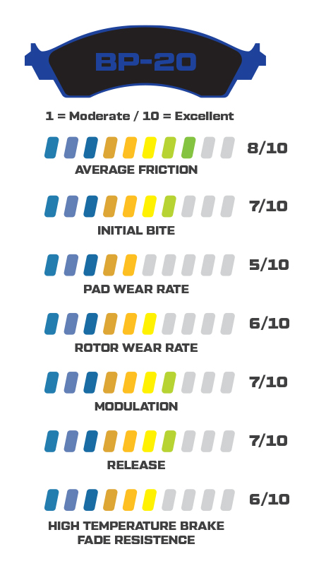 Klocki hamulcowe BP-20 (Street Performance / Racing Pads) Pad#: 7816 Mieszanka: BP-20 Charakterystyka produktu Klocki hamulcowe BP-20 to średniotarciowa mieszanka o szerokim zakresie temperatur pracy, łącząca komfort jazdy ulicznej z wydajnością torową. Zapewniają płynne i przewidywalne hamowanie, a współczynnik tarcia wzrasta wraz ze wzrostem temperatury tarczy, co przekłada się na stałą skuteczność w zróżnicowanych warunkach. Klocki BP-20 charakteryzują się umiarkowanym zużyciem przy wysokich temperaturach i są doskonałym wyborem dla samochodów sportowych i torowych, które nadal poruszają się po drogach publicznych. Cechy mieszanki BP-20: Średni współczynnik tarcia o szerokim zakresie temperaturowym Płynne załączanie i wzrost siły hamowania wraz z temperaturą Średnie zużycie przy dużym obciążeniu cieplnym Wysokowydajna mieszanka dla toru i ulicy Większy współczynnik tarcia i szerszy zakres pracy niż w BP-10 Doskonały wybór jako punkt odniesienia dla aut torowych z homologacją drogową Zastosowanie Rekomendowane do: Użytku ulicznego (Street Use OK) Street / Autocross Track Day Drag Race Średnio intensywne hamowanie w wyścigach Dirt i Asphalt Materiał tarczy (Rotor Material) Kompatybilne z: Stalą Stalą nierdzewną Żeliwem Wymiary klocka (Pad Dimensions) Grubość (in): 0.60 Powierzchnia (in²): 6.36 Objętość (in³): 3 Wstępnie dotarte (Bedded): Nie Pylenie i hałas (Dust & Noise Ratings) Poziom pylenia: Niski do umiarkowanego Poziom hałasu: Niski do umiarkowanego Uwagi dotyczące doboru mieszanki Przy wyborze klocków hamulcowych należy uwzględnić zakres temperatur pracy i wartość współczynnika tarcia. Dla torów asfaltowych i wyścigów szosowych optymalne są mieszanki działające powyżej 1000°F (538°C), natomiast dla zastosowań drag, dirt i street performance — 500–1000°F (260–538°C). W przypadku utraty skuteczności (fade) spowodowanej przegrzaniem zaleca się zwiększenie chłodzenia, użycie cięższego rotora lub wybór mieszanki o wyższym zakresie temperaturowym.