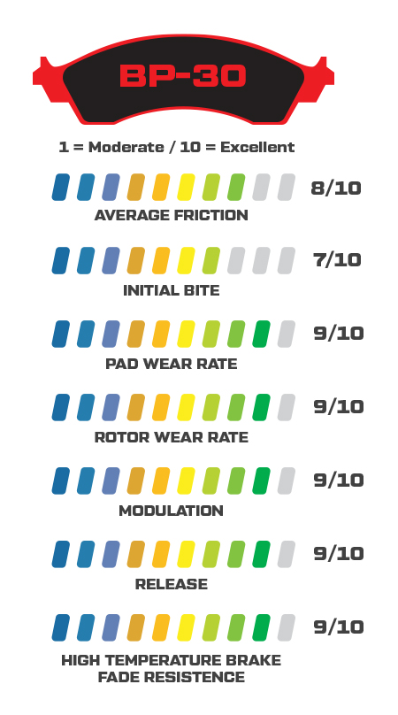 Klocki hamulcowe BP-30 (High-Temperature Racing Pads) Pad#: 7420 Mieszanka: BP-30 Charakterystyka produktu Klocki hamulcowe BP-30 to wysokotemperaturowa mieszanka o wysokim współczynniku tarcia, opracowana z myślą o zastosowaniach torowych i wyścigowych. Zapewniają średnią początkową reakcję, która zwiększa się wraz z temperaturą tarczy, oferując przy tym doskonałą modulację siły hamowania i przewidywalne działanie pedału. Dzięki niskiemu zużyciu przy długotrwałym hamowaniu w wysokich temperaturach oraz bardzo wysokiej odporności na fade cieplny, BP-30 stanowi idealny wybór dla profesjonalnych kierowców wyścigowych oraz użytkowników aut torowych. Cechy mieszanki BP-30: Wysoki współczynnik tarcia Średnia początkowa reakcja rosnąca wraz z temperaturą tarczy Stabilna, liniowa charakterystyka hamowania z doskonałą modulacją Bardzo wysoka odporność na przegrzewanie (fade) Niskie zużycie w warunkach wysokiej temperatury Przeznaczone do pracy z tarczami stalowymi lub żeliwnymi Zastosowanie Rekomendowane do: Zastosowań wyścigowych (brak homologacji drogowej) Off-Road Racing Road Course Pavement Oval Drag Racing (tarcze nierdzewne) Club Sport Racers Pojazdy torowe z systemem ABS Dirt Late Model Open Wheel Modified / Stock Car Materiał tarczy (Rotor Material) Kompatybilne z: Żeliwem Stalą Wymiary klocka (Pad Dimensions) Grubość (in): 0.80 Powierzchnia (in²): 8.2 Objętość (in³): 4.9 Wstępnie dotarte (Bedded): Nie Pylenie i hałas (Dust & Noise Ratings) Poziom pylenia: N/D Poziom hałasu: N/D Uwagi dotyczące doboru mieszanki Wybór odpowiedniej mieszanki zależy od temperatury pracy oraz wartości współczynnika tarcia. Dla większości wyścigów asfaltowych i torowych rekomendowane są mieszanki działające powyżej 1000°F (538°C). Aplikacje typu Dirt, Drag Race oraz Street Performance pracują zazwyczaj w zakresie 500–1000°F (260–538°C). W przypadku wystąpienia fade (utraty skuteczności z powodu przegrzania), zaleca się poprawę chłodzenia, zastosowanie cięższej tarczy lub mieszanki o wyższej odporności cieplnej.