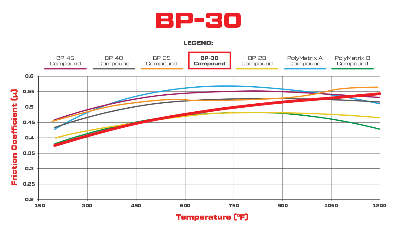 Klocki hamulcowe BP-30 (High-Temperature Racing Pads) Pad#: 7816 Mieszanka: BP-30 Wymiary klocka (Pad Dimensions) Grubość (in): 0.60 Powierzchnia (in²): 6.36 Objętość (in³): 3.00 Wstępnie dotarte (Bedded): Nie Pylenie i hałas (Dust & Noise Ratings) Poziom pylenia: N/A Poziom hałasu: N/A Charakterystyka produktu Klocki hamulcowe BP-30 to wysokotemperaturowa mieszanka wyścigowa zaprojektowana do pracy w ekstremalnych warunkach. Oferują wysoki współczynnik tarcia oraz średnią początkową reakcję, która zwiększa się wraz ze wzrostem temperatury tarczy. Dzięki liniowej charakterystyce działania, doskonałej modulacji i bardzo wysokiej odporności na fade, klocki BP-30 gwarantują powtarzalną skuteczność hamowania podczas długotrwałego obciążenia cieplnego. Cechy mieszanki BP-30: Wysoki współczynnik tarcia Średnia początkowa reakcja, rosnąca wraz z temperaturą Niskie zużycie przy intensywnym hamowaniu w wysokiej temperaturze Stabilne, przewidywalne i liniowe działanie Wysoka odporność na zanik skuteczności hamowania (fade) Do stosowania z tarczami stalowymi lub żeliwnymi Zastosowanie Klocki BP-30 przeznaczone są wyłącznie do użytku wyścigowego – nie do jazdy drogowej. Rekomendowane dla: Wyścigów Off-Road Road Course Pavement Oval Drag Racing (stal nierdzewna) Klubowych samochodów torowych z ABS Dirt Late Model Open Wheel Modified / Stock Car Materiał tarczy (Rotor Material) Kompatybilne z: Żeliwem Stalą Zakres pracy i dobór mieszanki Wybór klocków należy dopasować do temperatur pracy i wymaganego współczynnika tarcia: Asfalt i wyścigi torowe: powyżej 1000°F (538°C) Dirt, Drag Race i Street Performance: 500–1000°F (260–538°C) W przypadku utraty skuteczności (fade) spowodowanej przegrzaniem zaleca się poprawę chłodzenia, zastosowanie cięższej tarczy lub wybór mieszanki o wyższym zakresie temperaturowym.