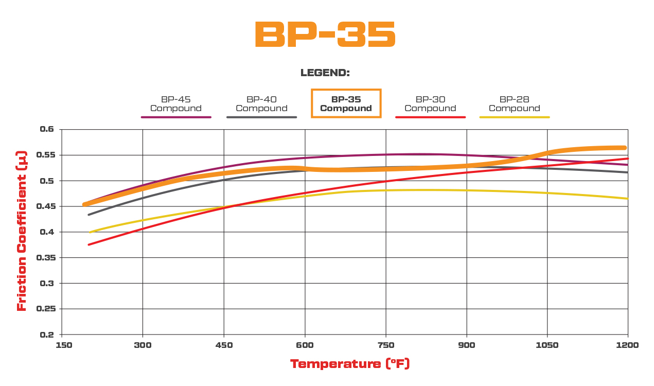 Klocki hamulcowe BP-35 (High-Temperature Racing Pads) Pad#: 7816 Mieszanka: BP-35 Charakterystyka produktu Klocki hamulcowe BP-35 to wysokotemperaturowa mieszanka o wysokim współczynniku tarcia, zaprojektowana dla zastosowań wyścigowych wymagających stabilnego i liniowego działania hamulców. Zapewniają płynne, przewidywalne czucie pedału, doskonałą modulację i stałą skuteczność nawet podczas długotrwałego hamowania w wysokich temperaturach. Klocki BP-35 wykazują niskie do średniego zużycie, co czyni je idealnym wyborem dla pojazdów torowych i wyścigowych z systemem ABS. Cechy mieszanki BP-35: Wysoki współczynnik tarcia z liniową charakterystyką działania Dobra skuteczność w niskich i średnich temperaturach, rosnąca wraz z rozgrzaniem rotora Gładka reakcja i doskonała modulacja hamowania Niskie do średniego zużycie klocka Stałe, przewidywalne czucie pedału hamulca Przeznaczone do tarcz stalowych i żeliwnych Zastosowanie Rekomendowane do: Wyłącznie do użytku torowego (nie do użytku ulicznego) Off-Road Racing Road Course Pavement Oval Dirt Late Model Open Wheel Modified / Stock Car Pojazdy torowe z systemem ABS Materiał tarczy (Rotor Material) Kompatybilne z: Żeliwem Stalą Wymiary klocka (Pad Dimensions) Grubość (in): 0.60 Powierzchnia (in²): 6.36 Objętość (in³): 3 Wstępnie dotarte (Bedded): Nie Pylenie i hałas (Dust & Noise Ratings) Poziom pylenia: N/D Poziom hałasu: N/D Uwagi dotyczące doboru mieszanki Dobór klocków należy dostosować do zakresu temperatur pracy oraz wartości współczynnika tarcia. Dla wyścigów asfaltowych i torowych zaleca się mieszanki pracujące w zakresie powyżej 1000°F (538°C). Zastosowania typu Dirt Track, Drag Race czy Street Performance działają zazwyczaj w zakresie 500–1000°F (260–538°C). Jeśli wystąpi fade (utrata skuteczności z powodu przegrzania), należy rozważyć lepsze chłodzenie, cięższy rotor lub klocki o wyższym zakresie temperaturowym.