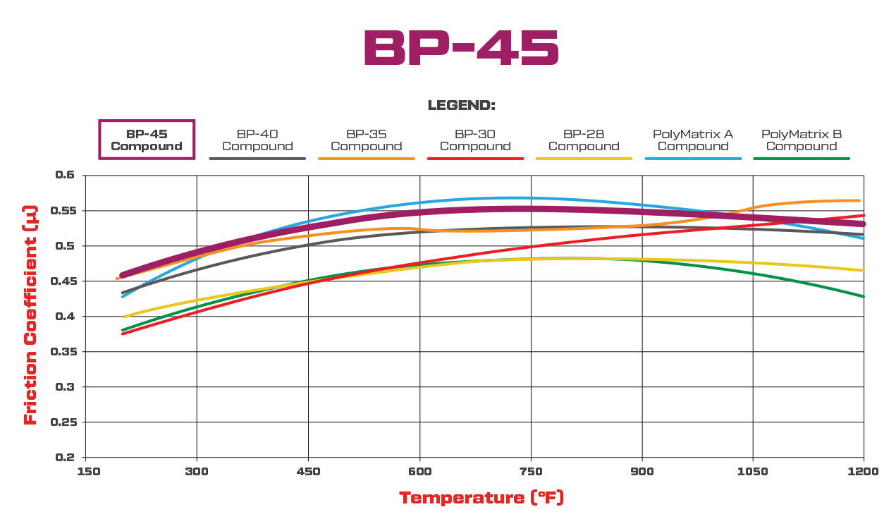 Klocki hamulcowe BP-45 (High-Temperature Racing Pads) Pad#: 7112 Mieszanka: BP-45 Wymiary klocka (Pad Dimensions) Grubość (in): 0.49 Powierzchnia (in²): 6.36 Objętość (in³): 2.10 Wstępnie dotarte (Bedded): Nie Pylenie i hałas (Dust & Noise Ratings) Poziom pylenia: N/A Poziom hałasu: N/A Charakterystyka produktu Klocki hamulcowe BP-45 to mieszanka o wysokim współczynniku tarcia, przeznaczona do zastosowań wyścigowych, zapewniająca doskonałą skuteczność w szerokim zakresie temperatur. Oferują wysoką przyczepność przy niskich temperaturach oraz płynny wzrost tarcia wraz z nagrzewaniem się tarczy, co gwarantuje przewidywalne, stabilne i powtarzalne działanie hamulców. Dzięki stałemu czuciu pedału i wysokiej odporności cieplnej, BP-45 zapewniają pełną kontrolę w każdych warunkach torowych. Cechy mieszanki BP-45: Wysoki współczynnik tarcia Bardzo dobra skuteczność przy niskich temperaturach Płynny wzrost tarcia w miarę nagrzewania tarczy Stabilne, przewidywalne działanie Stałe czucie pedału hamulca Przeznaczone do pracy z tarczami stalowymi i żeliwnymi Zastosowanie Klocki BP-45 są przeznaczone do wszystkich typów pojazdów wyścigowych, w tym do sportów torowych, wyścigów asfaltowych i off-road. Rekomendowane dla: Samochodów wyścigowych wszystkich klas Zastosowań torowych i wyścigów asfaltowych Pojazdów z tarczami stalowymi lub żeliwnymi Materiał tarczy (Rotor Material) Kompatybilne z: Żeliwem Stalą Zakres temperatur i dobór mieszanki Podczas doboru klocków należy uwzględnić temperaturę pracy i wymaganą wartość współczynnika tarcia: Asfalt i wyścigi torowe: powyżej 1000°F (538°C) Dirt, Drag Race i Street Performance: 500–1000°F (260–538°C) Jeśli wystąpi utrata skuteczności (fade) z powodu przegrzania, zaleca się poprawę chłodzenia, zastosowanie cięższej tarczy lub wybór mieszanki o wyższym zakresie temperaturowym.