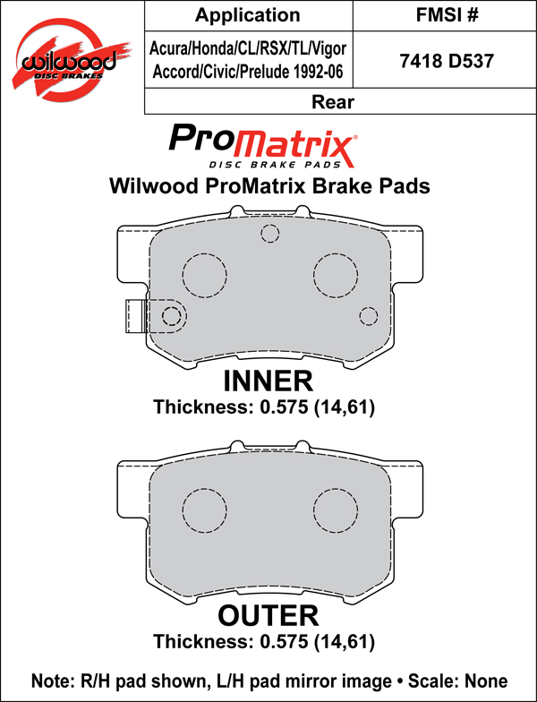 Klocki hamulcowe PM - ProMatrix (Street Performance / Racing Pads) Pad#: D537 Mieszanka: PM - ProMatrix Charakterystyka produktu Klocki hamulcowe PM - ProMatrix to wysokowydajne klocki o średnim współczynniku tarcia, przeznaczone do jazdy ulicznej i sportowej – idealne do autocrossu oraz track day. Zapewniają płynne i przewidywalne działanie hamulców, a ich skuteczność rośnie wraz ze wzrostem temperatury, co gwarantuje stabilne osiągi w szerokim zakresie warunków pracy. Charakteryzują się umiarkowanym zużyciem przy wysokich temperaturach, niskim poziomem hałasu oraz ograniczonym pyleniem, co wpływa na komfort użytkowania i czystość układu hamulcowego. W porównaniu do mieszanki BP-10, PM - ProMatrix oferuje większy zakres temperatur roboczych oraz wyższy współczynnik tarcia, zachowując przy tym komfort i cichą pracę. Cechy mieszanki PM - ProMatrix: Średni współczynnik tarcia Stabilna skuteczność w szerokim zakresie temperatur Płynne, progresywne działanie Umiarkowane zużycie w wysokiej temperaturze Niski poziom hałasu i ograniczone pylenie Zastosowanie Jazda uliczna Autocross Track day Materiał tarczy (Rotor Material) Stal Żeliwo Wymiary klocka (Pad Dimensions) Grubość (in): 0.58 Powierzchnia (in²): — Objętość (in³): — Wstępnie dotarte (Bedded): Nie Pylenie i hałas (Dust & Noise Ratings) Poziom pylenia: Niski do umiarkowanego Poziom hałasu: Niski Uwagi dotyczące doboru mieszanki Dobór odpowiednich klocków hamulcowych powinien uwzględniać temperaturę pracy i wartość współczynnika tarcia, które wpływają na skuteczność i trwałość hamulców. Dla zastosowań torowych i wyścigowych zalecane są mieszanki działające powyżej 1000°F (538°C), natomiast dla jazdy ulicznej i sportowej – 500–1000°F (260–538°C). Podane wartości są orientacyjne, gdyż rzeczywiste temperatury zależą od masy pojazdu, stylu jazdy i chłodzenia układu. W przypadku utraty skuteczności (fade) z powodu przegrzania zaleca się zwiększenie chłodzenia, zastosowanie cięższej tarczy lub wybór mieszanki o wyższej odporności cieplnej.