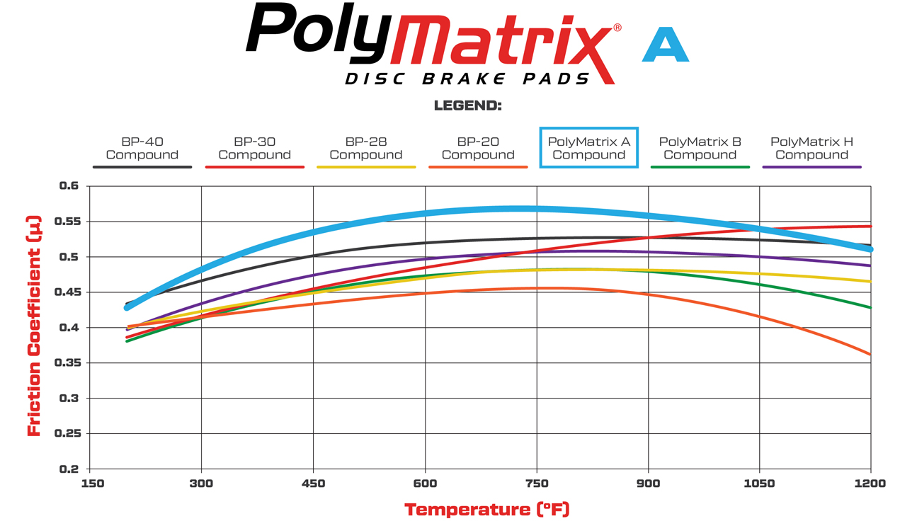 Klocki hamulcowe PolyMatrix A (High-Temperature Racing Pads) Pad#: 8716 Mieszanka: PolyMatrix A Charakterystyka produktu Klocki hamulcowe PolyMatrix A to profesjonalna, wysokotemperaturowa mieszanka o bardzo wysokim współczynniku tarcia, przeznaczona wyłącznie do zastosowań torowych i wyścigowych. Zapewniają bardzo agresywną reakcję początkową, natychmiastową skuteczność nawet przy niskich temperaturach oraz stabilne hamowanie w warunkach ekstremalnego obciążenia cieplnego. Charakteryzują się średnio-niskim zużyciem materiału ciernego i doskonałą odpornością na zanik skuteczności (fade). Nie są przeznaczone do użytku drogowego. Cechy mieszanki PolyMatrix A: Bardzo agresywna reakcja początkowa Wysoki współczynnik tarcia Skuteczne działanie w szerokim zakresie temperatur Niskie zużycie przy długotrwałym hamowaniu w wysokiej temperaturze Wysoka odporność na fade Zastosowanie Tylko do użytku torowego Wyścigi drogowe (Road Course) Tory asfaltowe typu Oval Wyścigi Dirt – wszystkie klasy Materiał tarczy (Rotor Material) Stal Żeliwo Wymiary klocka (Pad Dimensions) Grubość (in): 0.63 Powierzchnia (in²): 6.2 Objętość (in³): 2.8 Wstępnie dotarte (Bedded): Nie Pylenie i hałas (Dust & Noise Ratings) Poziom pylenia: N/A Poziom hałasu: N/A Uwagi dotyczące doboru mieszanki Podczas wyboru mieszanki należy uwzględnić zakres temperatur pracy i wartość współczynnika tarcia. Dla większości zastosowań torowych i asfaltowych rekomendowane są mieszanki działające powyżej 1000°F (538°C), natomiast dla drag race, dirt track i street performance – 500–1000°F (260–538°C). Jeśli pojawi się fade (utrata skuteczności hamowania) spowodowany przegrzaniem, należy zwiększyć chłodzenie, zastosować cięższy rotor lub użyć mieszanki o wyższym zakresie temperaturowym.