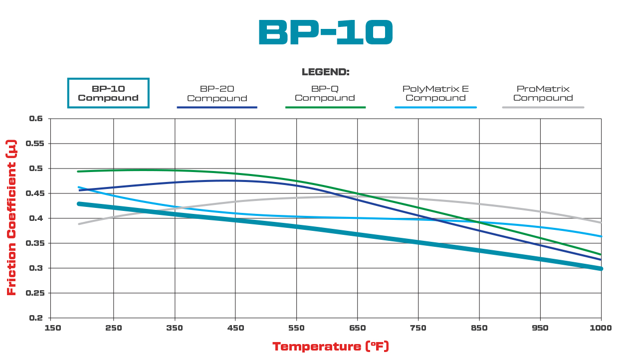 Klocki hamulcowe BP-10 (Street Performance / Racing Pads) Pad#: 6812 Mieszanka: BP-10 Wymiary klocka (Pad Dimensions) Grubość (in): 0.49 Powierzchnia (in²): 3.00 Objętość (in³): 1.10 Wstępnie dotarte (Bedded): Nie Pylenie i hałas (Dust & Noise Ratings) Poziom pylenia: Niski Poziom hałasu: Niski Charakterystyka produktu Klocki hamulcowe BP-10 to uniwersalna mieszanka o średnim współczynniku tarcia, zaprojektowana z myślą o połączeniu sportowej skuteczności z komfortem codziennej jazdy. Oferują płynną i przewidywalną reakcję hamowania, niskie zużycie oraz stabilne osiągi w szerokim zakresie temperatur. Dzięki niskiemu poziomowi pyłu i hałasu, klocki te zapewniają czyste, ciche i wydajne działanie układu hamulcowego. Cechy mieszanki BP-10: Średni współczynnik tarcia Płynna, liniowa reakcja pedału hamulca Niskie zużycie na tarczach żeliwnych Stała skuteczność w niskich i średnich temperaturach Bardzo niski poziom pyłu i hałasu Wyższa wydajność, mniejsze zużycie i niższe pylenie niż standardowe klocki OEM Zastosowanie Klocki BP-10 przeznaczone są do jazdy ulicznej i lekkich zastosowań sportowych. Idealne dla kierowców, którzy oczekują skutecznego hamowania i wysokiej trwałości. Rekomendowane do: Jazdy ulicznej i sportowej Muscle Cars Drag Racing Lekkich i średnich zastosowań off-road (Dirt, Late Models, Modified) Materiał tarczy (Rotor Material) Kompatybilne z: Stalą Żeliwem Zakres pracy i dobór mieszanki Dobór klocków powinien uwzględniać temperaturę pracy oraz wymagany poziom tarcia: Jazda uliczna i sportowa: 500–1000°F (260–538°C) Zastosowania torowe: powyżej 1000°F (538°C) W przypadku spadku skuteczności hamowania (fade) spowodowanego przegrzaniem zaleca się poprawę chłodzenia, zastosowanie cięższej tarczy lub klocków o wyższym zakresie temperaturowym.