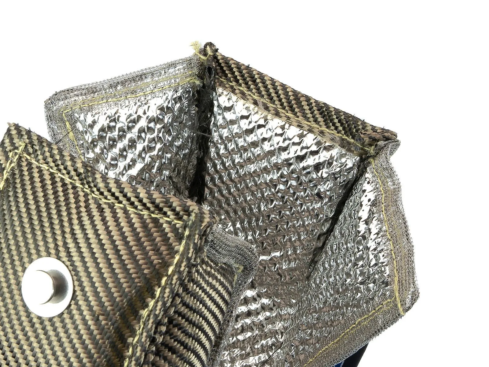FMIC.Pro Inconel Magma Carbon fiber Koc na turbo FMIC.Pro to profesjonalny produkt z zupełnie nowej, innowacyjnej serii termoizolacji. Pierwsza, wewnętrzna warstwa wykonana jest z inconelu, który dzięki odporności na utlenianie i korozję znajduje zastosowanie w przemyśle lotniczym, a jego temperatura topnienia sięga aż 1300’C. Wypełnienie koca stanowi gruba warstwa wełny ceramicznej, która skutecznie zatrzymuje temperaturę, a całość obszyta jest materiałem typu magma, znajdującego zastosowanie w bandażach termoizolacyjnych, dodatkowo przeplatanym z włóknami węglowymi (carbon fiber). Użycie warstwy z inconelu wymusiło zastosowania siatki nierdzewnej do obszycia koca, co dodatkowo wpływa na jego trwałość. Dzięki takiemu połączeniu, mimo stałego kontaktu z temperaturami przekraczającymi 1000’C, koc FMIC.Pro stanowi znakomitą barierę termiczną, nie odbarwia się, a po demontażu pozostaje elastyczny i nadaje się do ponownego założenia. Termoizolacja z serii FMIC.Pro może być stosowane w ekstremalnych warunkach, dzięki czemu jest wykorzystywana w profesjonalnych samochodach wyścigowych. Znakomicie obniża temperaturę pod maską, co korzystnie wpływa na pracę silnika i elementy układu chłodzenia, dodatkowo zwiększając energię wylotową spalin. Odporność temperaturowa: 1250’C Rozmiar muszli turbo: T25 Warstwa wewnętrzna: Inconel Warstwa wypełniająca: Wełna ceramiczna Warstwa zewnętrzna: Magma przeplatana włóknem węglowym Materiał obszycia krawędzi: Stal nierdzewna