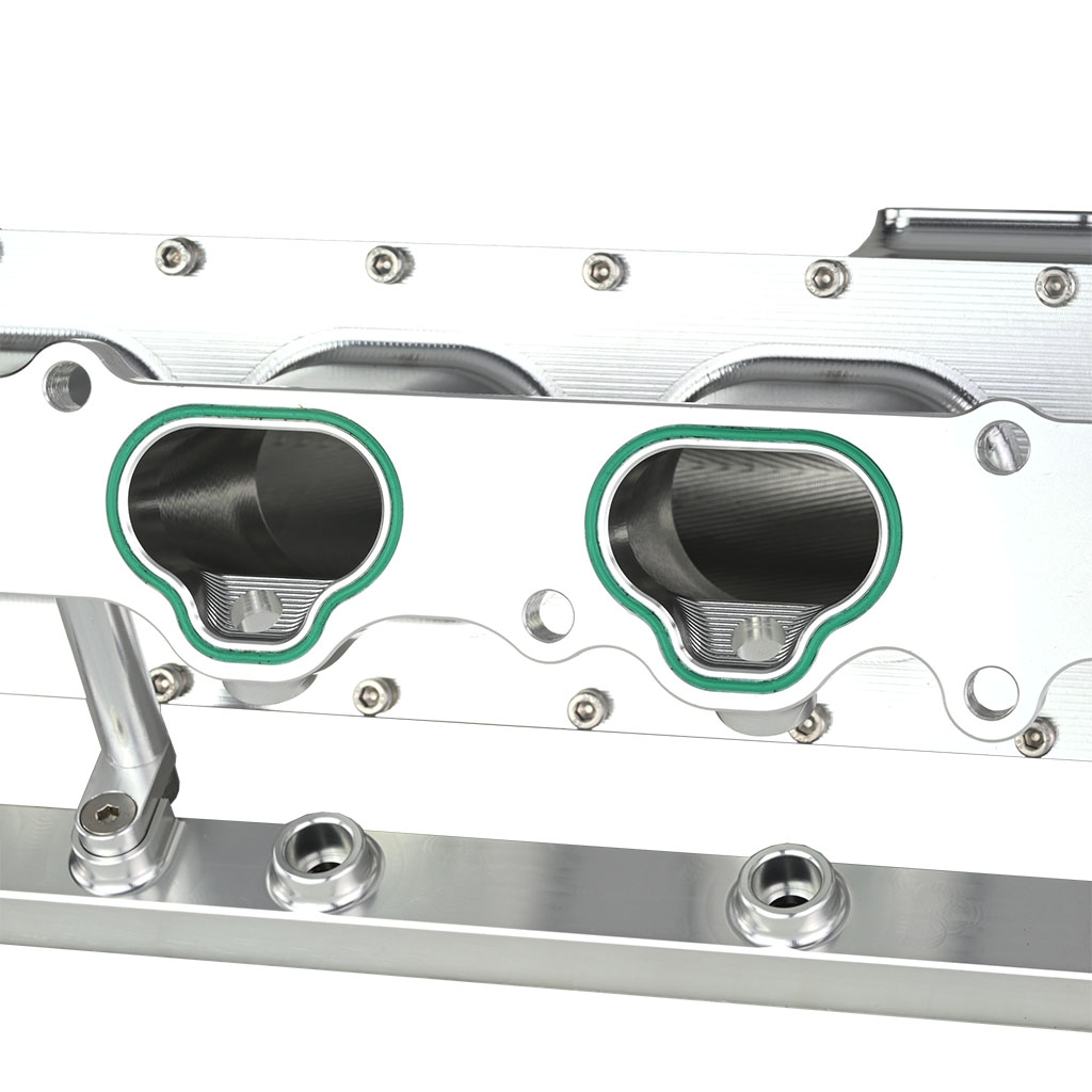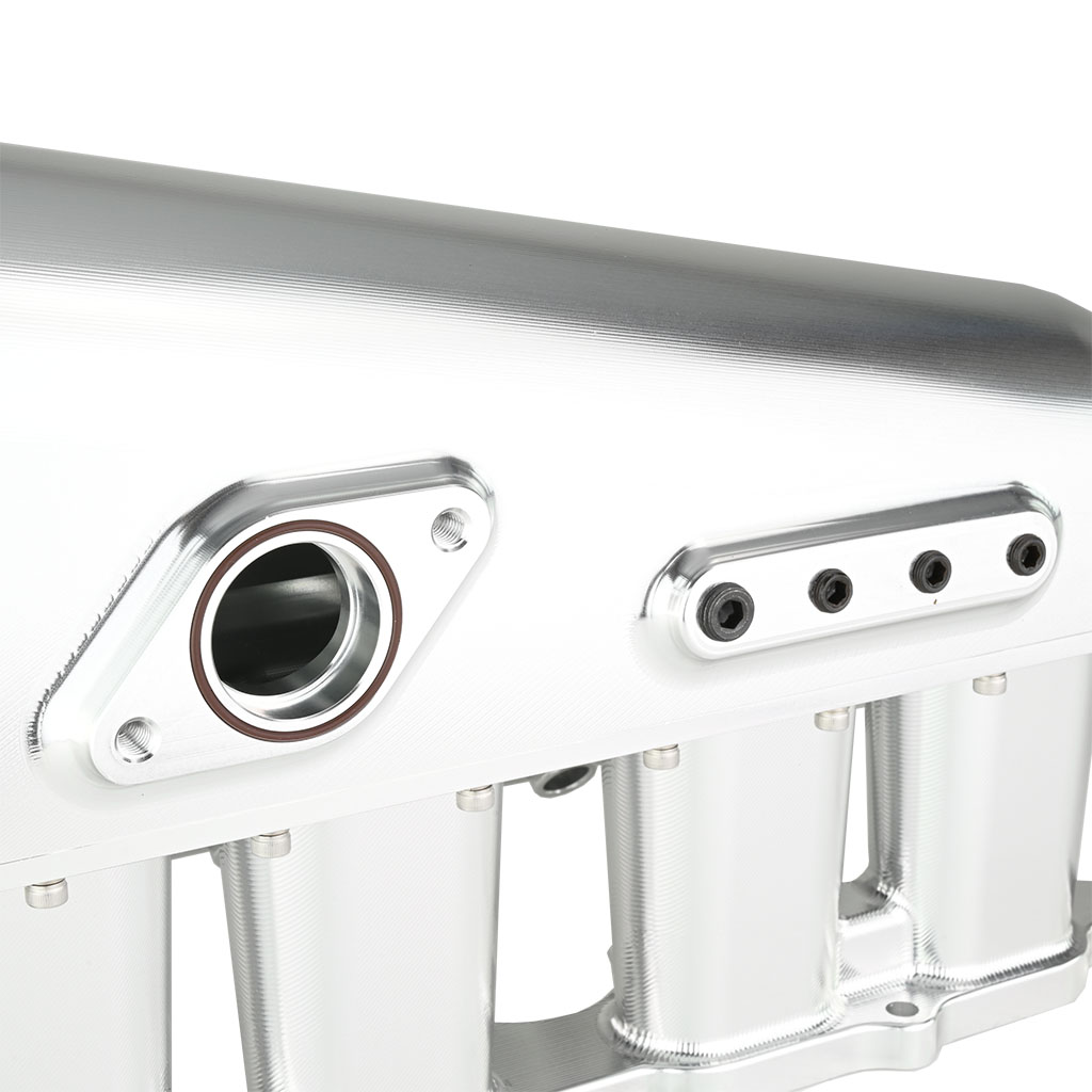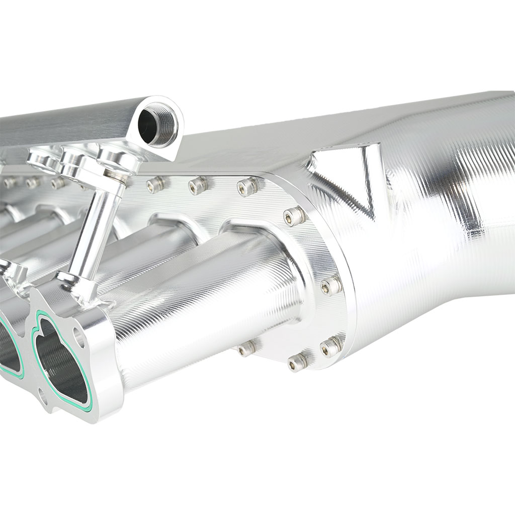 Kolektor ssący dolotowy CNC FMIC.Pro Toyota 2JZ- GE Tuningowy kolektor dolotowy FMIC.Pro do silników 2JZ‑GE, w całości wykonany w technologii CNC, to zaawansowana konstrukcja opracowana z wykorzystaniem obliczeniowej mechaniki płynów (Computational Fluid Dynamics – CFD). Geometria kanałów została zoptymalizowana w celu minimalizacji turbulencji, wyrównania rozkładu ciśnień oraz maksymalizacji strumienia objętościowego powietrza kierowanego do cylindrów. Analizy CFD pozwoliły uzyskać kolektor o wyjątkowo wysokiej sprawności przepływowej, zapewniający równomierne napełnianie cylindrów w pełnym zakresie obrotów. Efektem jest poprawiona charakterystyka momentu obrotowego, większa stabilność pracy jednostki napędowej oraz potencjał do osiągania wyższej mocy zarówno w zastosowaniach sportowych, jak i drogowych. Korpus kolektora został wykonany z wysokogatunkowego aluminium 6061‑T6, precyzyjnie wycinanego metodą CNC z jednego bloku materiału. Dzięki temu konstrukcja jest wyjątkowo wytrzymała i odporna na ekstremalne ciśnienia doładowania, eliminując ryzyko pęknięć. Dodatkowo kolektor wyposażony jest w zintegrowaną listwę wtryskową, co umożliwia montaż wtryskiwaczy i zapewnia pełną kompatybilność z układem paliwowym. Serce kolektora stanowią zintegrowane trąbki dolotowe (velocity stacks), których geometria zoptymalizowana w technologii CFD gwarantuje szybki, laminarny i równomierny przepływ powietrza do wszystkich cylindrów. Przekłada się to na efektywniejsze spalanie, wyższą sprawność silnika, realny wzrost mocy, lepszą reakcję na gaz oraz bardziej liniowe oddawanie momentu obrotowego w całym zakresie pracy silnika. - Konstrukcja z dwóch elementów CNC – korpus oraz flansza, precyzyjnie obrabiane dla idealnego dopasowania - Aluminium 6061‑T6 – lekki i sztywny materiał, odporny na wysoką temperaturę oraz korozję - Zintegrowane velocity stacks – zoptymalizowany przepływ powietrza i równomierne napełnienie cylindrów - Zamontowana listwa wtryskowa – ułatwia montaż tuningowych wtryskiwaczy i zapewnia pełną szczelność układu paliwowego - Obróbka CNC najwyższej precyzji – gwarancja jakości i powtarzalności wykonania - Większa objętość komory kolektora – stabilniejsza praca przy wysokim ciśnieniu doładowania - Testowany w warunkach torowych – sprawdzona wydajność i niezawodność w motosporcie - Zoptymalizowany przepływ powietrza – realny wzrost mocy i momentu obrotowego - Średnica gniazd wtryskiwaczy: 13 mm - Średnica przyłącza przepustnicy: 85 mm - Rozstaw otworów montażowych przepustnicy: 4 × 79 mm