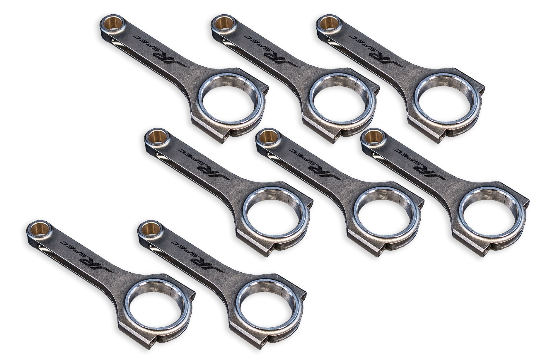 Komplet kutych korbowodów marki JRspec wykonanych w technologii H-beam do samochodu Audi V8Wykonane są z najwyższej jakości stali odkuwanej ANSI4340 (EN24), wytrzymałość przekraczająca 200KM na cylinder.Odgazowane próżniowo przed obróbką.Wszystkie odkuwki przed obróbka prześwietlane RTG.Obrabiane cieplnie (normalizowane).Po obróbce wyśrutowane powierzchniowo (odprężone).Krawędzie wyrównane. Każdy otwór był dwukrotnie honowany (przed i po spasowaniu stopy), co gwarantuje jego idealny okrąg (tolerancja 0,01mm). Oprócz tego korbowody zostały skątowane (są idealnie proste w pionie) do 0,01mm - wielu markowych producentów ma tu rozbieżności przekraczające nawet 0,1mm, co skutkuje szybszym wycieraniem się panewek! Każdy pojedynczy komplet korbowód + stopa posiada swój indywidualny numer. Komplety pakowane wg wagi i wyważone END to END. Główki dodatkowo wzmocnione, posiadające najwyższej jakości tuleje z brązu w miejscu osadzenia sworznia tłoka. Korbowody zostały przetestowane w ponad 1500 konnej Calibrze Tsunami. Długość: 159mmSworzeń: 20mmRodzaj - Korbowody + śruby ARP