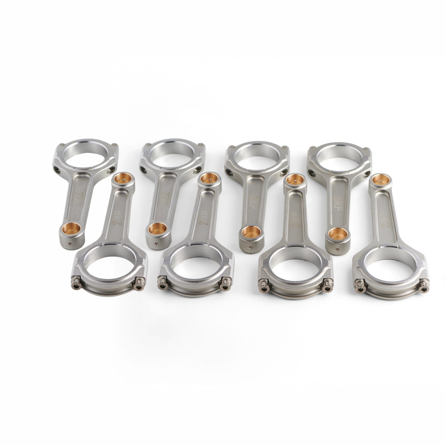 The I-Beam series Connecting rods for Audi 4.2L RS6 C5 V8 Twin-Turbo aimed for the High Hp/Boost applications. Built from the finest raw materials 4340 high tensile steel with a specially optimized shape for high performance and extreme durability.They feature “straight cut” pin end for increased durability, so they can only be used in conjunction with aftermarket pistons. The bushings are made from AMPCO 18 material, for excellent resistance to wear and fatigue and have radial groove acting as an oil reservoir. They are shot peened to relieve stress from the material and multi-stage heat treated to increase rigidity. The tight tolerances in the production process, ensure a perfect fitment while optimizing the oil clearances. Bend and twist is tightly controlled.Each rod includes ARP 2000 cap fasteners that are rated at 220,000psi, optional ARP L19 material 260.00psi available as an upgrade and the whole kit is supplied with ARP moly and full fitting instructions. Additional machining processes “Straight Cut” Pin End – Suitable for aftermarket pistons Dowel sleeves for perfect fit and accurate re-assembling Lipped Cap Relief for improved big-end integrity at extreme application Grooves in Thrust Face for weight reduction Technical Features of ZRP Connecting Rods I-Beam Shape for extra rigidity Two-Piece forging for great strength Shot Peening for improved fatigue life Magnaflux Inspection guarantees that the consistency of the forged material meets our high-quality standard Double ribbed caps for added support Multi Stage Heat Treatment for maximum strength, dimensional stability, and fatigue life. CNC machining for superior tolerances, precise as much as 0.0002″ Center to center is maintained under .001″ tolerance Finite Element Analysis (FEA) Computer generated stress analysis of con rods Optimal balancing for weight matched sets of ± 1gram