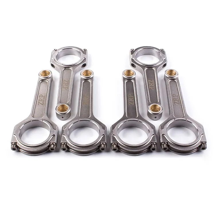 The I-Beam “Heavy Duty” series Connecting rods with L19 Bolts for Audi 2.9L TFSI RS4 / RS5 aimed for the High Hp/Boost applications. Built from the finest raw materials 4340 high tensile steel with a specially optimized shape for high performance and extreme durability.They feature “straight cut” pin end for increased durability, so they can only be used in conjunction with aftermarket pistons. The bushings are made from AMPCO 18 material, for excellent resistance to wear and fatigue and have radial groove acting as an oil reservoir. They are shot peened to relieve stress from the material and multi-stage heat treated to increase rigidity. The tight tolerances in the production process, ensure a perfect fitment while optimizing the oil clearances. Bend and twist is tightly controlled.Each rod includes ARP 2000 cap fasteners that are rated at 220,000psi, optional ARP L19 material 260.00psi available as an upgrade and the whole kit is supplied with ARP moly and full fitting instructions. Additional machining processes “Straight Cut” Pin End - Suitable for aftermarket pistons Dowel sleeves for perfect fit and accurate re-assembling Lipped Cap Relief for improved big-end integrity at extreme application Grooves in Thrust Face for weight reduction Technical Features of ZRP Connecting Rods I-Beam Shape for extra rigidity Two-Piece forging for great strength Shot Peening for improved fatigue life Magnaflux Inspection guarantees that the consistency of the forged material meets our high-quality standard Double ribbed caps for added support Multi Stage Heat Treatment for maximum strength, dimensional stability, and fatigue life. CNC machining for superior tolerances, precise as much as 0.0002" Center to center is maintained under .001" tolerance Finite Element Analysis (FEA) Computer generated stress analysis of con rods Optimal balancing for weight matched sets of ± 1gram