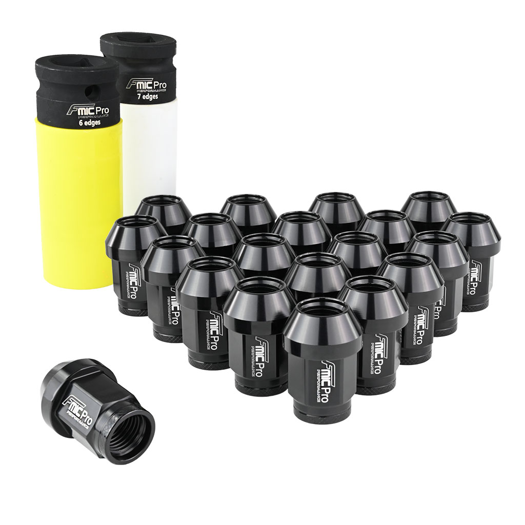 Kute nakrętki aluminiowe do kół FMIC.PRO M14x1.5 Czarne 20szt. stożkowe przelotowe Popraw wygląd zewnętrzny swojego samochodu z pomocą zestawu aluminiowych nakrętek zabezpieczających Fmic.pro. . Nakrętki do felg samochodowych wykonane z lotniczego stopu aluminium 7075-T6, charakteryzującego się wysoką wytrzymałością mechaniczna oraz doskonałą odpornością na zmęczenie materiału. Dzięki zastosowaniu precyzyjnego procesu kucia uzyskano jednorodną strukturę, zwiększona gęstość oraz lepsze właściwości mechaniczne, co przekłada się na optymalną trwałość i bezpieczeństwo w warunkach intensywnej eksploatacji. Szczególnie polecane do sportów motorowych, takich jak drift, rajdy, wyścigi torowe, rallycross, oraz time attack, gdzie wymagana jest niezrównana jakość, niezawodność i bezpieczeństwo przy ekstremalnych obciążeniach. Niska waga 17 g szt. stanowi lekką, ale wytrzymałą alternatywę dla standardowych nakrętek. Każdy zestaw zawiera 16 standardowych nakrętek, oraz 4 nakrętki siedmiokątne zabezpieczające. W zestawie dwie kute nasadki do demontażu. Nakrętki o konstrukcji otwartej o całkowitej długości 35 mm i radełkowanym końcem dla szybkiej instalacji. Nakrętki FMIC.Pro występują w kolorach: czarnym, niebieskim, srebrnym, czerwonym, szarym (gun metal). - Do szpilek M14 x 1,5 - 16 szt. nakrętek sześciokątnych przelotowych - 4 szt. nakrętek siedmiokątnych przelotowych - W komplecie dwie nasadki 19mm ze stali chromowo-molibdenowej - Tuleja zabezpieczająca nasadki z miękkiego tworzywa - chroni felgę przed możliwością uszkodzenia powłoki lakierniczej. - Długość nakrętki: 35 mm - Materiał: aluminium 7075-T6 - Wyjątkowo lekkie,1 szt. waży 17 g - Obniżenie masy rotacyjnej - Maksymalna wytrzymałość na rozciąganie: 73 500–76 300 psi