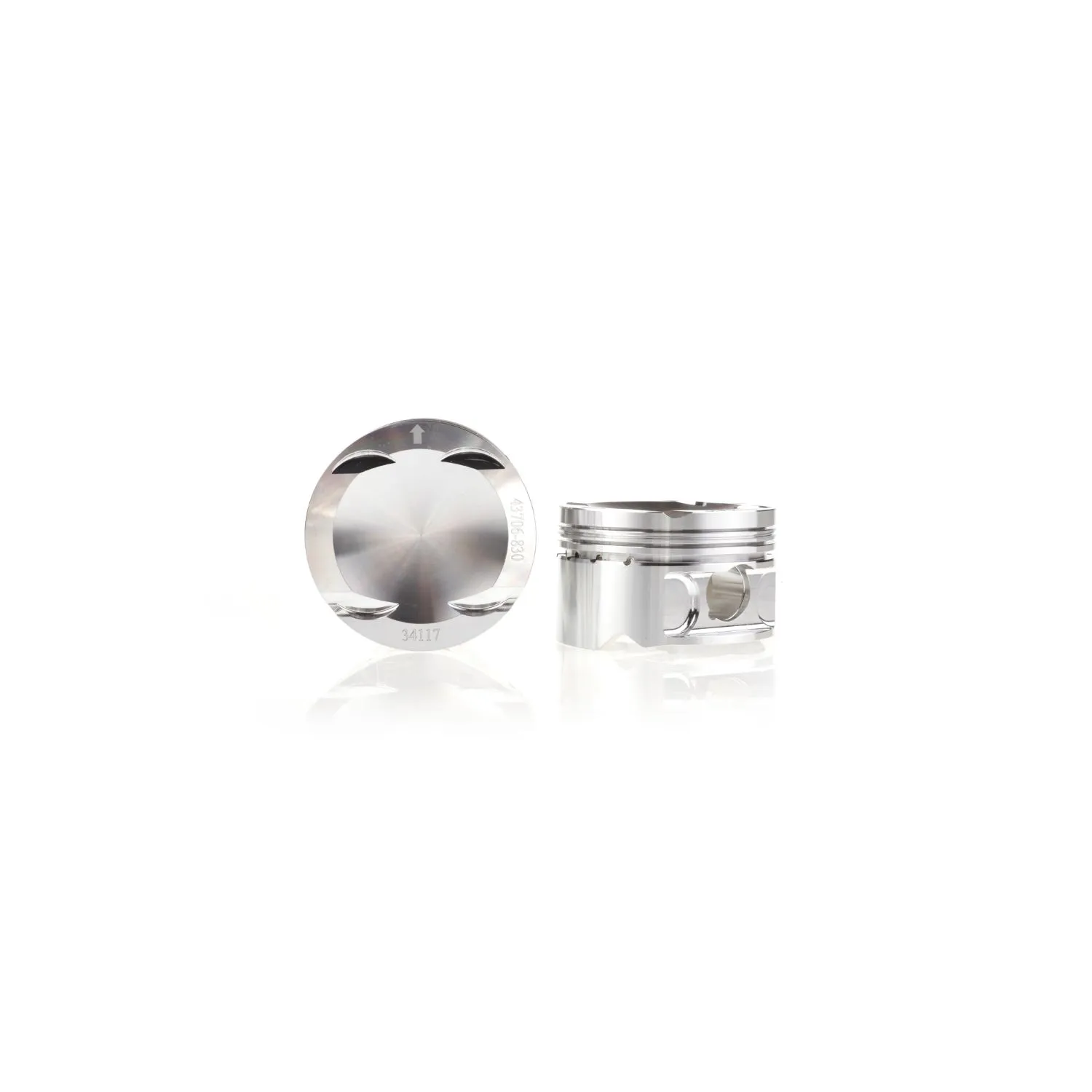 The Audi / VW 2.0L TFSI pistons are developed for mild to high tuning, mainly for road or club race cars that want to develop their engine for high mileage and/or street use. Designed by ZRP engineers and manufactured in Germany from 4032 (T6) high-silicon, low-expansion alloy. This allows the engine builder to run a closer piston to bore clearance thus producing a better seal. This minimizes the slapping noise during cold start, common place among engines running forged pistons, providing a quite operation and low oil consumption. We have chosen a Full round skirt design with bottom reinforcing band, with oversize and deeper valve pockets to allow high lift camshaft profiles to be used. They have Offset pins for quiet operation and the wrist pins are made from 9310 alloy. Other features include Anti-detonation grooves to protect the first rings, gas pressure accumulator groove for better ring seal and vibration relieve. Premium Japanese quality 1.00mm x 1.20mm x 2.80mm ring package included. *Note: Pistons are designed to be used in all engine configurations with 21.00mm pin. Product Features and Design Anti-detonation grooves for long wear life and performance Gas pressure accumulator groove in the 2nd ring land for longer wear life. Horizontal slots in the pin bore designed to allow oil to enter between the wrist-pin and pin-bore area. Precision CNC machined ring grooves 4032-T6 high-silicon / low-expansion alloy Honed pin bores Clip cuts on the edge of the Intake side Full Round skirt design with bottom reinforcing band for High HP/Boost applications Valve Pockets designed to allow over size valves and high lift camshafts Pistons designed to optimize squish for longer engine life and increased horsepower potential Optional coatings offered per request Thermal barrier coating “Blast Off Bronze" Moly Side-Skirt and Under-Crown coating “Stealth Black”