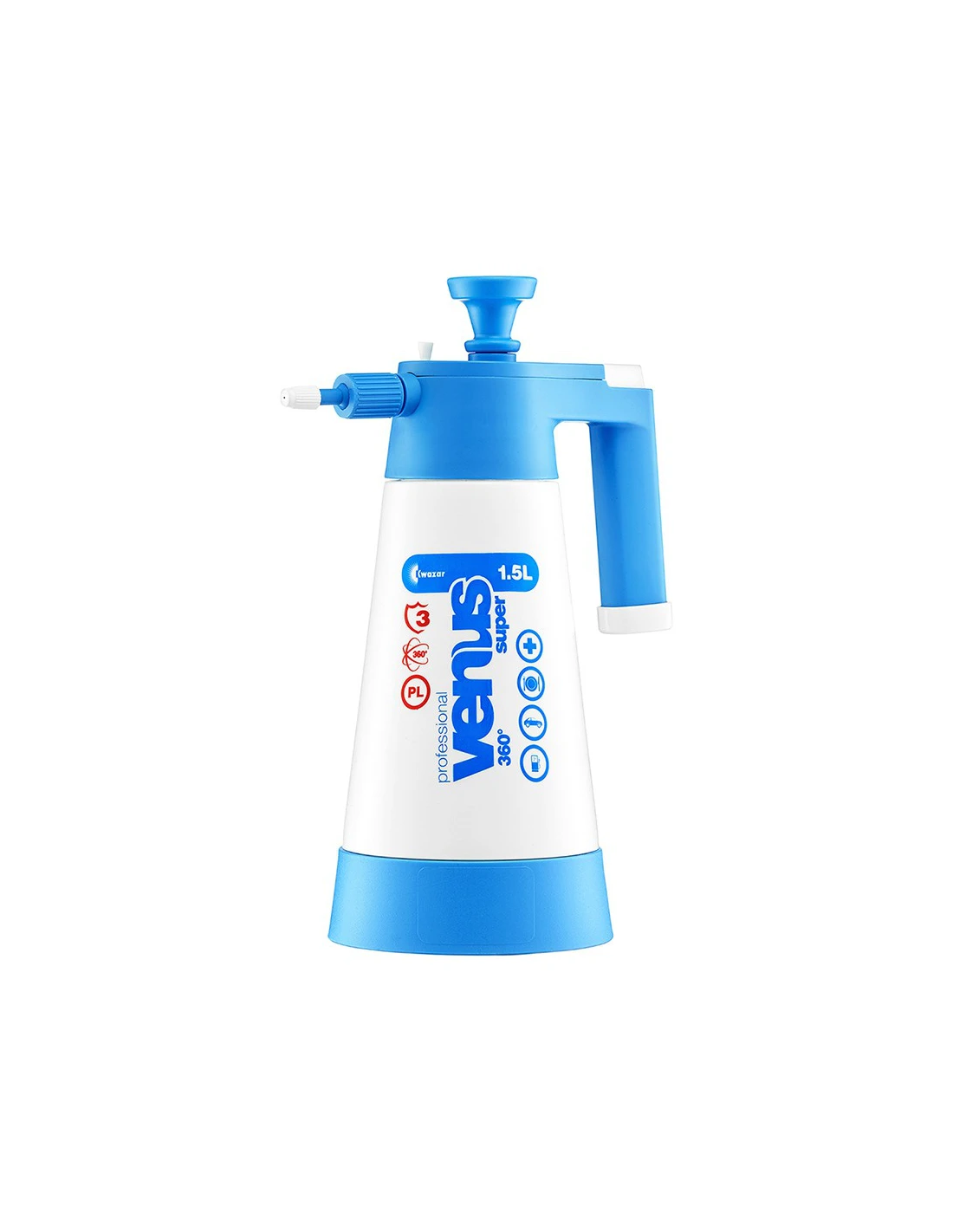 Venus SUPER 360 PRO+ Opryskiwacze ciśnieniowe Venus Pro+ Super 360 przeznaczone są do aplikacji środków chemicznych na małych i średniej wielkości powierzchniach. Wszystkie uszczelnia opryskiwacza wykoanae są z Vitonu. Dzięki temu opryskiwacz charakteryzuje się podwyższoną odpornością na środki kwaśne i zasadowe. Opryskiwacz Venus Pro+ Super 360 wyposażony jest w elastyczną rurkę ssącą z obciążeniem. Umożliwia to aplikację cieczy niezależnie bez względu na położenie zbiornika. Wysoki stopień rozpylenia cieczy i duża jednorodność kropel gwarantują równomierne pokrycie powierzchni aplikowaną cieczą. W połączeniu z możliwością regulacji strumienia cieczy daje to możliwość aplikacji środków chemicznych w nieograniczonym wręcz zakresie. Zbiornik opryskiwacza wyposażony jest w pasek poziomu cieczy i skalę pojemności. Opryskiwacze Venus Pro+ Super wyposażone są w podstawy stabilizujące, które jednocześnie izolują zbiornik od podłoża. Głowica opryskiwacza wyposażona jest w zawór bezpieczeństwa. Prosta konstrukcja pompki, umożliwia bez narzędziową naprawę i konserwację opryskiwacza. Cechy produktu: Pojemność: 1,5L Waga: 625g Wysokość: 33cm