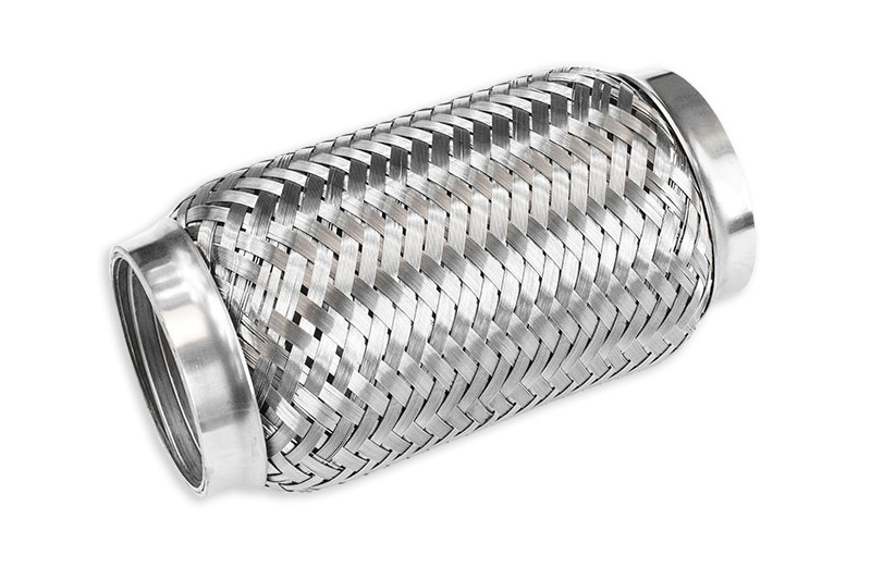 Nierdzewny łącznik elastyczny do wydechu. pasujący do rury 63mm, który jest niezbędnym elementem przy budowie układu wydechowego. Zastosowanie łącznika redukuje drgania wynikające z pracy wydechu podczas pracy silnika i w trakcie jazdy. Produkt FMIC posiada wewnętrzny peszel, który znacznie wzmacnia całą konstrukcje łącznika, dzięki czemu można go stosować w samochodach z turbo, nawet z wysokim doładowaniem i launch control'em. Do wyboru długości 100mm, 150mm, 200mm i 250mm.