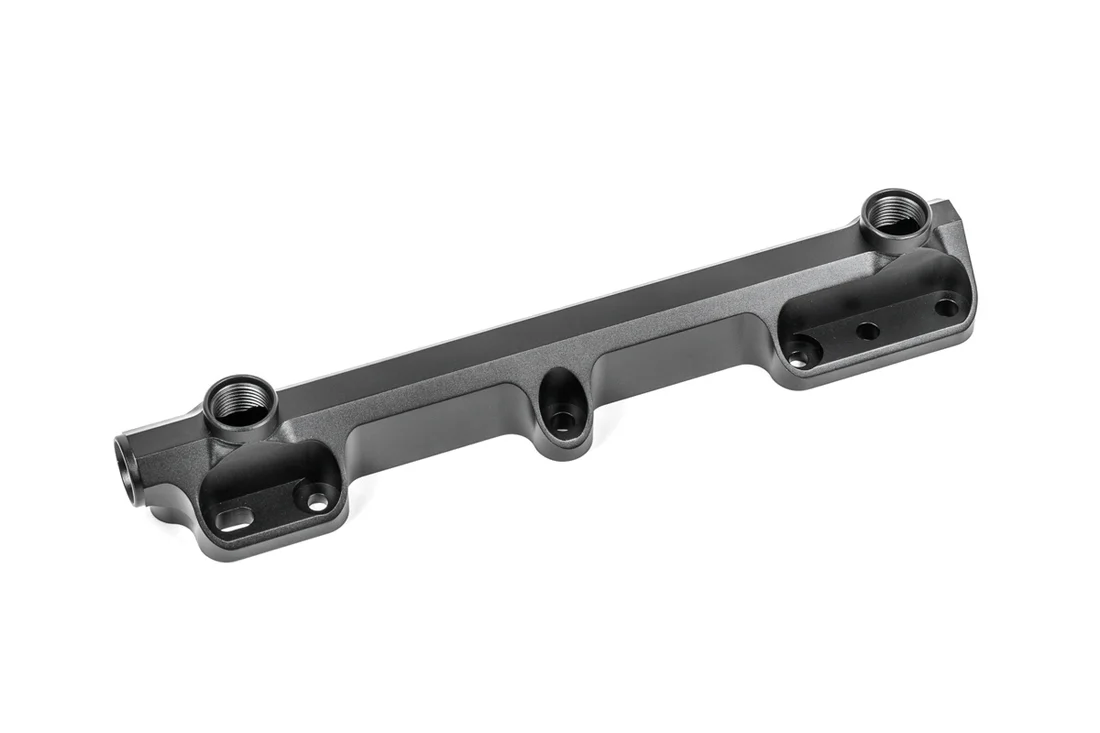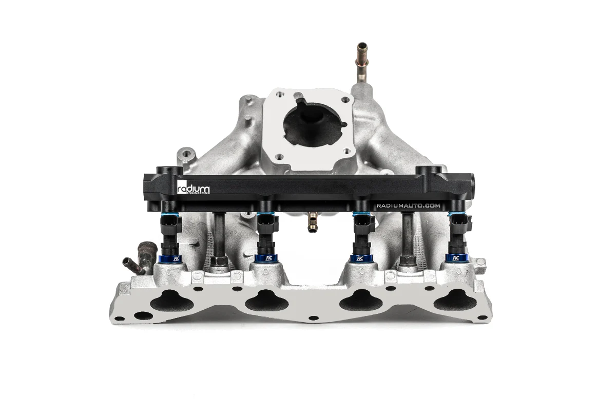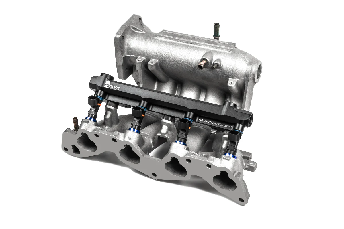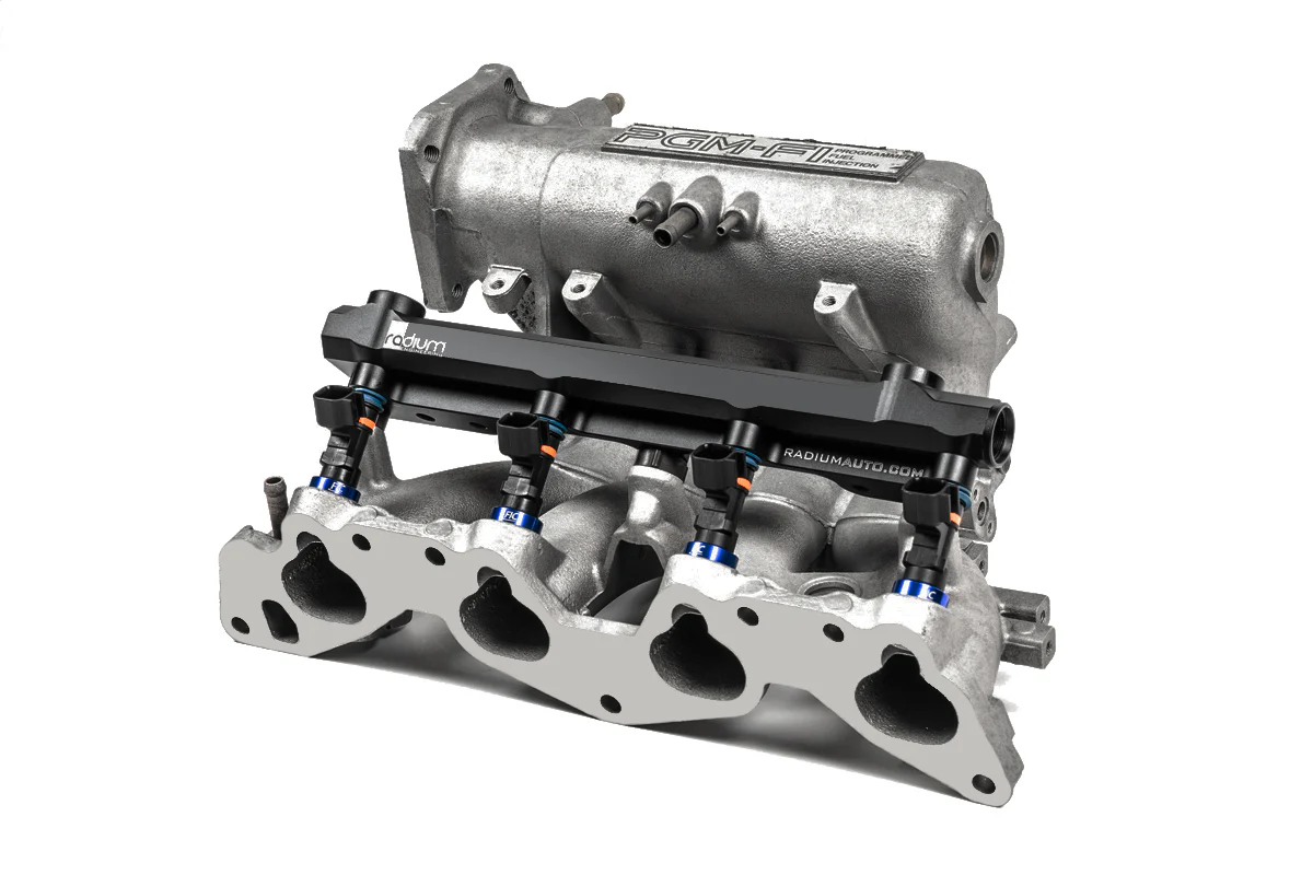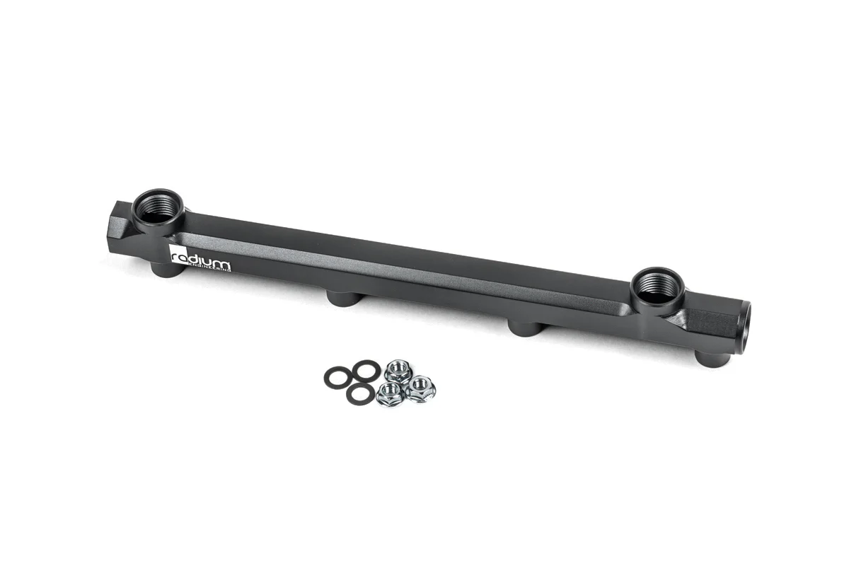 Kompatybilność Honda D15B Honda D15Z Honda D16A Honda D16B Honda D16Y Honda D16Z Honda ZC SOHC Honda ZC DOHC Dopasowanie do kolektorów dolotowych aftermarketowych nie zostało przetestowane i nie może być potwierdzone. Listwa paliwowa zachowuje fabryczne punkty montażowe oraz pozycjonowanie OEM. Listwa paliwowa została zaprojektowana z dużym wewnętrznym kanałem przepływu, umożliwiającym obsługę pełnych wymagań mocy silnika. Wykonana jest metodą obróbki CNC z aluminium 6061, anodowana oraz znakowana laserowo, co zapewnia wysoką jakość wykończenia powierzchni. Podobnie jak w przypadku listwy OEM, gniazda wtryskiwaczy mają średnicę 11 mm, co pozwala na zastosowanie seryjnych wtryskiwaczy lub ich odpowiedników aftermarketowych. 20-1070 Fuel Rail, Honda D-Series Kompatybilność wtryskiwaczy paliwa Listwa paliwowa jest kompatybilna z fabrycznymi wtryskiwaczami lub wtryskiwaczami typu OEM equivalent. W przypadku wymiany wtryskiwaczy muszą one zachować: identyczną wysokość jak OEM, zgodne wymiary górnych i dolnych O-ringów. Radium Engineering nie określa dodatkowych parametrów wtryskiwaczy poza wymogiem zgodności z OEM. Zaleca się konsultację z producentem wtryskiwaczy aftermarketowych. Porty i złączki Listwa paliwowa posiada 4 porty z gwintem 7/8”-14, przystosowane do złączek typu 8AN ORB. Kompatybilne akcesoria: Adaptery 8AN ORB Regulatory ciśnienia paliwa montowane bezpośrednio (8AN ORB) Tłumiki pulsacji paliwa 8AN ORB Adaptery manometrów ciśnienia paliwa Dobór odpowiednich złączek zależy od konkretnej aplikacji. Należy zapewnić odpowiednią ilość miejsca wokół portów listwy paliwowej, szczególnie przy montażu regulatorów, manometrów oraz tłumików pulsacji. Rysunki wymiarowe dostępne na stronach produktowych mogą posłużyć do weryfikacji prześwitów.