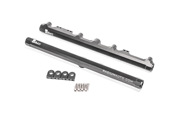 PORTS AND FITTINGS The fuel rail ports are tapped for 8AN ORB. 8AN ORB Adapter Fittings.8AN ORB Direct Mount Regulators.8AN ORB Fuel Pulse Dampers.Fuel Pressure Gauge Adapters. Appropriate fittings must be selected based on the specific application. Ample space around the fuel rail port(s) is necessary for larger accessories such as fuel pressure regulators, fuel pressure gauges, and fuel pulse dampers. To verify clearance, the dimensional drawings on the product pages can be used as a reference guide. COMPATIBILITY 02-04 Toyota 4Runner Non VVT-i 99-04 Toyota Tundra Non VVT-i 98-05 Toyota Land Cruiser Non VVT-i 00-04 Toyota Sequoia Non VVT-i 02-04 Lexus GX470 Non VVT-i 98-05 Lexus LX470 Non VVT-i *Because of cam sensor interference, these fuel rails are NOT compatible with VVT-i engines. OVERVIEW Manufactured with 0.7" large internal bores, the Radium Engineering fuel rails can support all necessary engine power requirements. The modular mounting feet make these fuel rails compatible with the early non VVT-i intake manifold. INJECTORS The machined injector ports are compatible with 11mm upper injector O-rings. The fuel rails are compatible with OEM fuel injectors (or equivalent). PORTS Each fuel rail has three 8AN ORB (3/4"-16) ports. Adapter fittings and fuel hose will need to be purchased separately. FEATURES Anodized surface finish for wear and corrosion resistance Lighweight aluminum construction Inner bore diameter: 0.7 inch Reuses thermal insulating spacers No special tools required for installation Instructon PDF