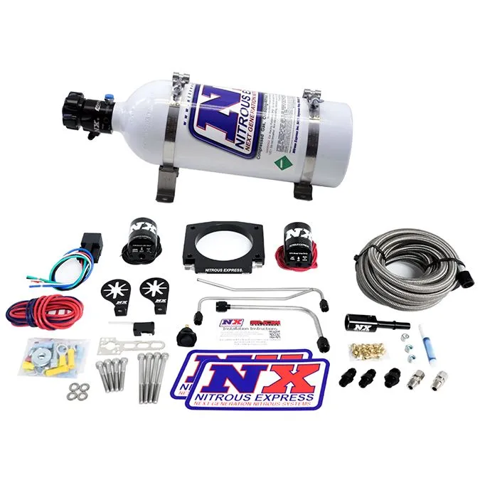 LS Single Entry 90mm Plate Hardline System (50-400Hp) The Nitrous Express LS 90mm Plate System features a billet plate. This 90mm plate bolts between the throttle body and intake, making installation quick, easy, and attractive. The system comes as a single-stage system and includes jetting for 50, 100, 150, 200, 250, 300, 350, and 400 horsepower. (Fits 90 and 92mm Throttle Bodies)This system includes our top-of-the-line ProPower Lightning series solenoids. Systems with a bottle include the Lightning 500 bottle valve, 6AN feedline, stainless steel solenoid to plate lines, stainless bottle brackets, a master arming switch, a WOT switch, as well as every nut, bolt, and electrical connector needed to complete the installation.This system includes the latest technology and the best components available. NX Lightning solenoids feature an improved flow path that eliminates sharp turns and expansion areas in the nitrous flow path. This keeps the nitrous in dense liquid form which makes more power utilizing less nitrous. Lightning nitrous solenoids feature an integrated purge port, which allows you to connect a purge valve directly to the body of the nitrous solenoid for clean looks and less plumbing. Lightning Series solenoids feature CNC aluminum bodies topped with Carbon Fiber cans for the ultimate in weight savings. Systems with a bottle include the billet aluminum Lightning 500 bottle valve. This valve not only looks great; It is packed with features including two integrated gauge ports, a 5/8 siphon tube, a large .500 orifice, and an improved flow path with only one 45-degree turn. The Lightning bottle valve looks great, flows great, and weighs nearly one full pound less than our old-style brass valve. If you have an aftermarket engine management system that is capable of adding nitrous enrichment fuel and want this system DRY (no fuel components), please contact us THE NITRO BOTTLE IS EMPTY!