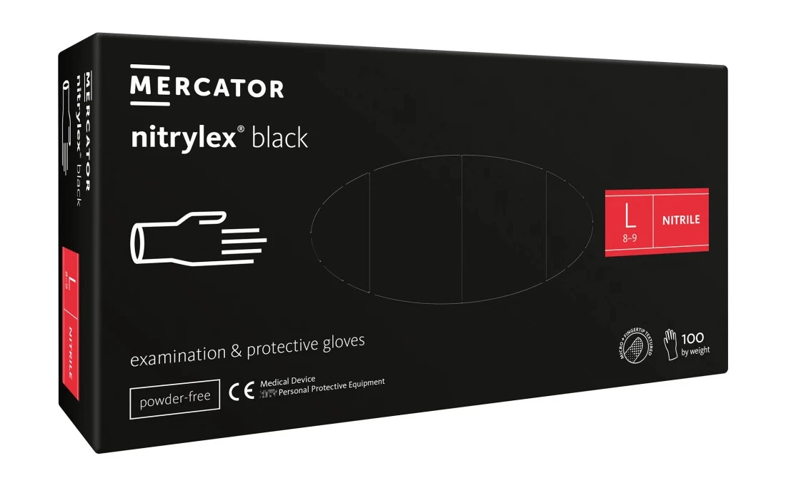 nitrylex black 100 szt. rękawice diagnostyczne i ochronne, nitrylowe, bezpudrowe, czarne nitrylex black to nitrylowe rękawice diagnostyczne, ochronne, niejałowe. Teksturowane na końcach palców, bezpudrowe. Powierzchnia wewnętrzna chlorowana. Mankiet rolowany. RYZYKO: Komponenty użyte w produkcji rękawic mogą powodować reakcje alergiczne. Niektóre rękawice mogą zawierać składniki będące przyczyną wystąpienia alergii u osób na nie uczulonych, u których mogą powstawać kontaktowe podrażnienia i/lub reakcje alergiczne. W przypadku wystąpienia reakcji alergicznej skonsultuj się z lekarzem. NORMY I CERTYFIKATY Wyrób ten jest produktem posiadającym wszelkie certyfikaty, zgodnie z najnowszymi wymaganiami regulacyjnymi w zakresie wyrobów medycznych, środków ochrony indywidualnej, wyrobów przeznaczonych do kontaktu z żywnością. Tym samym wyrób spełnia również najwyższe standardy jakościowo-produktowe, przewidziane dla wyrobów medycznych, środków ochrony indywidualnej, wyrobów przeznaczonych do kontaktu z żywnością. Potwierdzenie powyższych zapisów oraz wykaz certyfikatów, norm i przepisów prawno-regulacyjnych, dotyczących wyrobu znajduje się w Deklaracji Zgodności. Rozmiar: L Opakowanie zawiera 100 sztuk rękawiczek