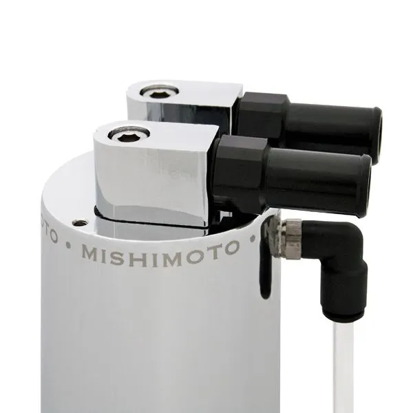 The Mishimoto Aluminum Oil Catch Can will prevent a harmful buildup of oil inside of the turbocharger, intake manifold, intercooler and piping. Our catch can prevents oil from getting into pressurized turbo plumbing and stops oil vapors from getting into the intake system that would ultimately lead to lower combustion temperatures and reduced overall efficiency. The polished Mishimoto Aluminum Oil Catch Can comes complete as a kit containing a mounting bracket, hose, all necessary clamps, fittings, and mounting hardware, for a perfect upgrade in performance and aesthetics for your car. This oil catch can, as with all our catch cans, comes with the unparalleled Mishimoto Lifetime Warranty you know and trust.Our catch cans are different from most air-oil-separator (AOS) systems on a few levels. First, our catch cans are not heated. This means that all of the blow-by is able to condense in the can, including low-octane oil vapors and contaminated fuel vapors. Most AOS systems also drain the blow-by back into the oil pan, while our catch cans trap the blow-by and keep it out of the engine permanently. If you've seen what we've seen in the bottom of our catch cans, you won't want that draining back into your oil either.Separates oil particles from PCV/CCV airDiameter: 2.5" / Can Height: 6.2" / Overall Height: 7"Weight: 0.95lbs / Fluid Capacity: 480ccDefends intercooler, intake system, and essential components from oil blow-byMishimoto Lifetime Warranty