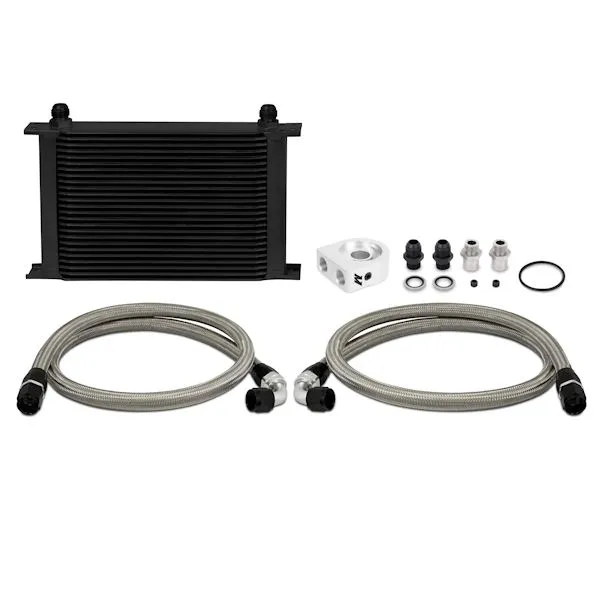 Proper oil temperature regulation is key to extending and preserving the life of your stock or high performance engine. Keep your temperatures in check with the Mishimoto 25-Row Universal Oil Cooler Kit. This kit is applicable for most vehicles and includes all key components for reducing oil temperatures and providing your engine with extra protection against oil degradation. This kit includes a billet anodized aluminum sandwich plate in either standard or thermostatic form. The optional Mishimoto Thermostatic Sandwich Plate provides additional temperature control and will limit oil flow to the cooler until optimal temperatures are reached, making it ideal for those in cooler climates. The included core is our proven 25-row stacked-plate cooler, which can withstand high fluid pressures and significantly reduce oil temperatures while exhibiting minimal pressure loss. This kit includes both a 3/4" -16 and M20-1.5 sandwich plate adapter which supports fitment for most makes and models. This kit also includes pre-assembled stainless steel braided oil lines with -10AN fittings and dowty seals for durable, leak free connections. Whether you are piloting a boosted rotary or a blown small block, the Mishimoto 25-Row Universal Oil Cooler Kit will provide the efficiency you need to stay on the track and out of the shop. As with all our products this kit includes the Mishimoto Lifetime Warranty.25 row stacked plate cooler with universal fitmentOverall Size: 12.95" x 8.35" x 1.97" / Core: 11" x 7.32" x 1.97" / Rows: 25Withstands high fluid pressures and reduces oil temperaturesIncludes both a 3/4" -16 and M20-1.5 sandwich plate adapterMishimoto Lifetime Warranty