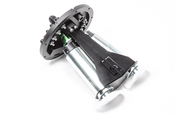 The MPFST can be selected with or without fuel pumps installed. If the option "... Pumps Not Included" is selected, the MPFST comes ready for the end user to install 1, 2, or 3 pumps. NOTE: The brushless Ti Automotive E5LM MPFST is designed for 1 or 2 pumps (shown below).
