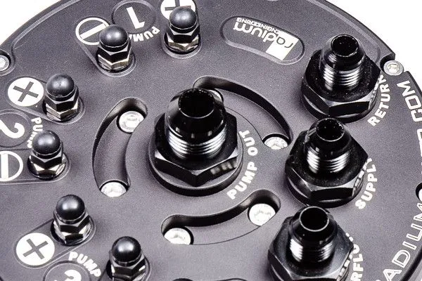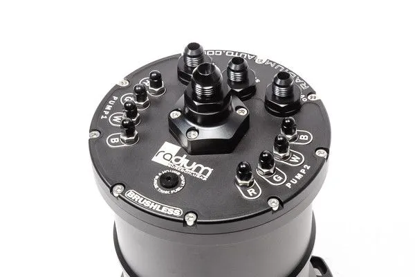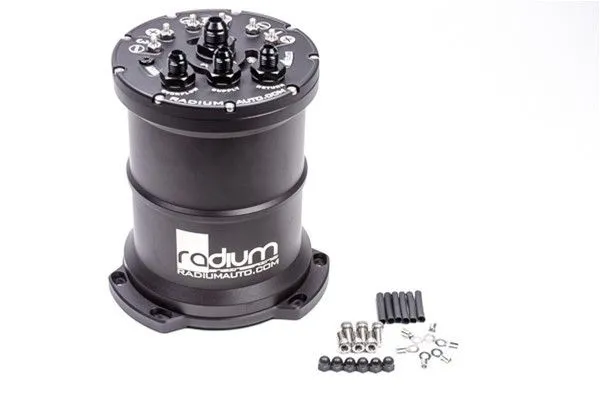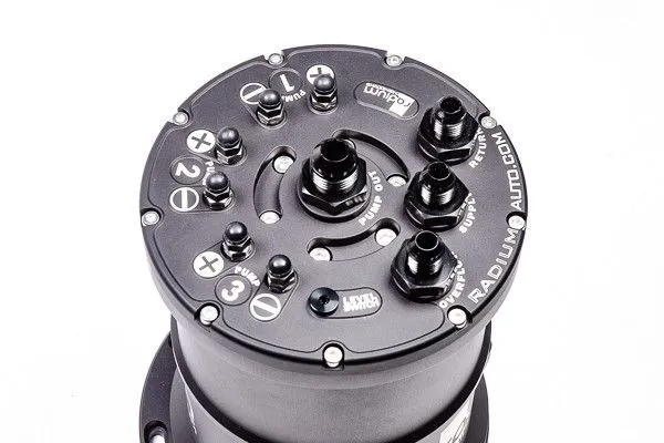 What is a fuel surge tank? A fuel surge tank (FST) is designed to prevent fuel starvation to the engine on vehicles with inadequate fuel tank baffling. Fuel is supplied to the surge tank by a lift pump, which in most cases is the OEM in-tank fuel pump. The volume of fuel inside the surge tank acts as a buffer to always keep the FST pump(s) supplied with fuel, even if the lift pump starves momentarily. This volume is maintained by the lift pump as well as the fuel returning from the fuel pressure regulator. Excess fuel in the surge tank is returned back to the vehicle's main fuel tank. The surge tank also provides a quick and easy way to upgade any standard fuel system without opening the stock fuel tank. This is an excellent fueling solution for vehicles installing large demand power upgrades such as forced induction. Multi-Pump Fuel Surge Tank (MPFST) Recently redesigned for 2019, the Radium Engineering MPFST is the perfect solution for high power vehicles experiencing fuel starvation during aggressive driving. Multiple high flowing fuel pumps can be used in the surge tank. Because the compatible pumps utilize a check valve, the MPFST merges all pumps into a single outlet simplifying external plumbing. NOTE: The brushless Ti Automotive E5LM MPFST includes check valves (shown below in green). This "PUMP OUT" port is 10AN ORB threaded but comes preinstalled with a -8AN male adapter fitting. The "OVERFLOW", "SUPPLY", and "RETURN" ports are all 8AN ORB threaded but come preinstalled with -6AN male adapter fittings. All of these fittings can be swapped out with different sizes (sold separately). When fuel enters the MPFST through the "SUPPLY" and "RETURN" ports, it gets redirected and runs tangential through the canister creating a swirl pot. This helps eliminate unwanted air bubbles and fuel foam that can affect fuel pump and engine performance. The pumps are mounted using an anodized aluminum bracket. All internal wires are gasoline, ethanol, and methanol compliant. The brushless Ti Automotive E5LM MPFST (shown above) utilizes a standard press-in filter sock included commonly with the pump All other (brushed pumps) pumps use the provided stainless steel mesh inlet screen for pre pump filtration shown above. The pump power connections are handled with specially designed high-current electrical studs. Necessary ring terminals and hardware are included with every surge tank. As shown, the underside of the MPFST is suitable for uneven surfaces commonly found in the trunk of a vehicle. Stainless steel M6x1.0mm socket head bolts are included for custom mounting. PUMP SELECTION The MPFST can be selected with or without fuel pumps installed. If the option "... Pumps Not Included" is selected, the MPFST comes ready for the end user to install 1, 2, or 3 pumps. NOTE: The brushless Ti Automotive E5LM MPFST is designed for 1 or 2 pumps (shown below). OPTIONS 20-0461 Fuel Level Switch, 1/8 NPT 20-0519 Fuel Level Switch Plus Diagnostic Indicator Instruction PDF
