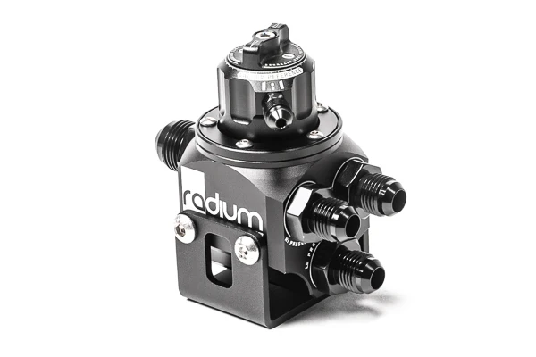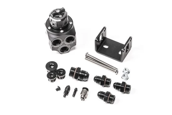 The Multi-Port Regulator (MPR) is a great solution for both simple and complex high-flow fuel systems. Its unique port configuration makes it ideal for combining dual fuel pumps into a single feed line. Conversely, it can be used to split a single feed line to a dual bank fuel system with 2 fuel rails. In addition, it can also be used for single pump or single fuel rail applications by simply plugging the unused ports. MOUNTING There are many unique ways to mount this regulator. For example, wall mounting can be accomplished by using the M6 holes that pass through the regulator body or the included mounting bracket can be used for floor mounting. M6x1mm hardware is provided. PLUMBING This regulator can be plumbed many different ways to suit various installations, such as traditional flow-through or dead-head systems. Because of this flexibility, it eliminates the need for an extra 'Y' fitting. The lower 2 opposing return ports are unique in that they flow parallel with the pressure ports eliminating the need for elbow fittings. Either lower port can be used for the return line. Plug(s) are provided for unused ports. FUEL PRESSURE ADJUSTMENT RA-series regulators feature the first tool-less pressure adjustment. A jam nut and set screw are no longer required. With a simple turn of the knob, pressure will be increased or decreased. Additionally, there are no inherent air (vacuum/boost) leaks through the threads that traditionally a smoke detector would pick up. To aid in adjusting pressure, there are incremental detents that provide haptic feedback to the user. Every detent permits 1psi (+/-0.5psi) of adjustment depending on current fuel pressure. FUEL PRESSURE STABILITY With years of track and bench testing data, the RA-series regulators have been refined to optimize pressure management. A newly designed single stainless steel return orifice generates laminar flow that enhances stability control. Minimum Pressure: 18.5psi (1.3bar) Maximum Pressure: *N/A *This is rhetorical. The maximum pressure is dependent on the relief valve inside the pump or the maximum current the fuel pump controller allows. ABOUT FUEL PRESSURE DROP AFTER SHUTOFF Some installations may experience a rapid fall of fuel pressure when the engine and/or fuel pump shuts off. This is considered normal operation for aftermarket fuel pressure regulators, regardless of brand. This can occur due to the diaphragm seat and the return orifice not fully sealing when fuel flow is stopped. For regulators to have the ability to regulate high fuel flow rates, the size of these components must be increased. This creates larger sealing surfaces between the components, preventing them from forming a perfect seal, even with high spring rates. This is not an indication of an issue or defect and it is not a cause for concern on its own. You do NOT need to contact technical support about this issue. Fuel pressure will reset immediately when the fuel pump is activated again. If the engine is experiencing other symptoms such as long cranking to start, or delays in pressure building when cranking, these symptoms are unrelated to the regulator. There is likely an issue with the fuel feed hose draining back to the tank. This is most likely due to an internal leak somewhere in the pump module, ie: a venturi jet pump, or the lack of a fuel pump check valve. 1:1 RISING RATE VACUUM REFERENCE RA-series regulators feature a 360 degree swiveling vacuum reference port that is double O-ring sealed. This is the first in the industry. It permits the installer to quickly point the vacuum fitting in any direction with no tools required. There are 4 interchangeable 10-32 threaded vacuum port fittings provided to cover all scenarios. Barbed Fitting: A black zinc-plated 3/16' (5mm) barb machined from high strength steel that is compatible with the following vacuum hoses: 5/32' (4mm), 3/16' (5mm), and 7/32' (6mm). 3AN Male Fitting: A black zinc-plated adapter machined from high strength steel that is compatible with 3AN hose ends. Push-To-Connect: A nickel-plated brass fitting with Buna-N O-rings that is compatible with hard plastic 1/4' OD tubing. Vacuum Plug: A black oxide stainless steel screw that is used to maintain a constant (non dynamic) fuel pressure. Beginning in the mid 1990s, vehicle manufacturers started transitioning to returnless fuel systems to lower EVAP emissions. To keep temperatures lower, these regulators are mounted inside the tank and do NOT have the ability to be vacuum referenced. This plug would be required in this scenario. NOTE: When installing the vacuum fitting, it is recommended to use a wicking medium-strength threadlocker. FUEL COMPATIBILITY All RA-series regulators are suitable with all gasoline types including unleaded, leaded, oxygenated, and pre-mixes. Furthermore, they are compatible with alcohol blends of fuel including methanol, ethanol, and E85. INCLUDED Main Rotating Assembly Mounting Bracket with Hardware 5mm Barbed Vacuum Fitting Vacuum Plug Fitting (Returnless) 1/4' Push-To-Connect Vacuum Fitting 3AN Male Vacuum Fitting 6AN ORB plug (x2) 8AN ORB plug (x1) 6AN ORB to 6AN male adapter (x3) 8AN ORB to 8AN male adapter (x1) Instruction PDF