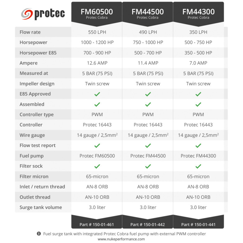 The Cobra fuel pump from UK fuel pump manufacturer Protec fills your every possible need from 500 hp to 1200 hp. We have selected three different assemblies to suit the Nuke Performance customer's every need. All versions are delivered preassembled with a Deutch connector between the surge tank and the external PWM controller. And each fuel pump is fitted with a lightweight, replaceable 65-micron pre-filter for long life and extremely high durability.