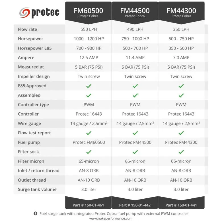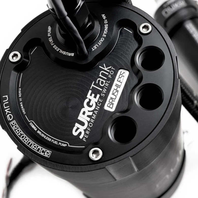 The 2nd generation 3.0-liter Fuel Surge Tank from Nuke Performance, with a preassembled, brushless Protec Cobra fuel pump. This is a next-generation fuel setup in one lightweight and universal solution. The newest updated version of the classic Nuke Performance fuel surge tanks series comes delivered with a preassembled brushless fuel pump from Protec Cobra-series. This is really next-level engineering, with maximum flow and minimum ampere.    Twin-screw brushless fuel pump  Higher pressure with fewer amps  100% Safe for all type of fuels, including ethanol  Preassembled with Cobra fuel pump  Lightweight aluminum billet fuel pump housing  Delivered with external PWN controller  For your every need, from 500 to 1200 horsepower  3.0-liter surge tank capacity   The Cobra brushless fuel pump has been engineered to provide precise fuel flow for the most demanding applications. It is suitable for use with ethanol, methanol, and petrol (gasoline). The Cobra pump is able to deliver fuel at higher pressures while using fewer amps, all thanks to its brushless technology. The Cobra fuel pump is lighter than any comparable fuel pump and features a custom-built brushless motor with an ultra-efficient pump mechanism that provides unrivaled performance.   Protec Cobra brushless fuel pumps, engineered to optimize flow with fewer amps Each Protec Cobra-series fuel pump is engineered with the latest fuel pump technology to optimize flow. Thanks to the brushless technology and the lightweight, yet oversized fuel pump billet aluminum housing, it is able to deliver fuel at higher pressures while using fewer amps. With the possibility to control the fuel pump speed, you can use high speed for drag racing or drifting or lower speed for street use and performance from one single unit. This is the next level of fuel delivery and comes in a ready-to-use package, installed within the lightweight motorsports 3.0-liter surge tank from Nuke Performance.   Preassembled fuel surge tank with in-tank Cobra fuel pump, ready to play and delivered with a PWM controller The Cobra fuel pump from UK fuel pump manufacturer Protec fills your every possible need from 500 hp to 1200 hp. We have selected three different assemblies to suit the Nuke Performance customer's every need. All versions are delivered preassembled with a Deutch connector between the surge tank and the external PWM controller. And each fuel pump is fitted with a lightweight, replaceable 65-micron pre-filter for long life and extremely high durability. The Cobra fuel surge tank is available with three different fuel pump options:  FM44300 350 LPH (92 gal/h) at 5 BAR (72 PSI) and 7.0A  FM44500 490 LPH (129 gal/h) at 5 BAR (72 PSI) and 11.4A  FM60500 550 LPH at 5 BAR (72 PSI) and 12.6A   These brushless fuel pumps with the high-tech twin-screw technology give you higher fuel flow/pressure with fewer amps in comparison to traditional fuel pumps with a corresponding fuel flow. The twin-screw design is also superior to turbine brushless fuel pumps. The fuel pump of your choosing can be selected upon ordering.   Control your fuel flow and pressure with PWM Less noise, lower fuel temperature, and fewer amperes   With the included external PWM controller you can control the fuel pump without any hassle. This helps you keep the fuel temperature lower, less noise, fewer amperes, and longer fuel pump life.    A lighter solution than our other surge tank fuel pump combinations The billet design fuel pump housing of the Protec Cobra fuel pumps is mounted directly to the surge tank top lid. With a minimum of parts, no external wires or connectors, and without any needed internal brackets, this solution is more than 30% lighter than a flow-comparable traditional setup. In combination with the 2nd generation surge tank from Nuke Performance, this is the highest possible surge tank with an in-tank fuel pump solution on the market. And thanks to brushless technology it is also quieter than any other of our available solutions.  More flow with less amount of amps  Significantly longer life than a traditional fuel pump  Up to 1200hp at only 12.6 ampere  Twin-screw brushless fuel pump  Cross fuel compatibility  Much quieter than other fuel pumps High flow fuel pump without heavy customization to the fuel tank Extreme driving such as drifting, drag racing, and track days where you exceed 2g can result in fuel loss. With our Fuel Surge Tank, you minimize the risk of your system not coping while running at low fuel levels. With this setup, you can rely on maximum fuel delivery, while securing a safe solution for your engine and setup even when the conditions are as demanding as they get. You can mount a brushless, high flow in-tank fuel pump without larger customization of your stock fuel tank is almost as important, making this is the only setup you need.   The 2G Fuel Surge Tank 3.0-liter with Protec Cobra brushless fuel pump works as a buffer so that the fuel pumps are always supplied with fuel for high outputs. As the return line from your engine routs straight back into the FST, it stays full at all times.   Made for all type of motorsports use, easy to adapt to all your fuel system needs and demands  The Cobra surge tank comes ready for AN-10 ORB outlet and AN-8 ORB return, inlet, and return to fuel tank fittings with a wide variety of sizes available to choose from. The use of the oversized, high flow AN-10 ORB outlet gives you a single fuel line that creates no limitations for your every need between 500 to 1200 horsepower.  Outlet fittings : AN-10 ORB to AN-6 Male Part # : 700-04-108 AN-10 ORB to AN-8 Male Part # : 700-04-109 AN-10 ORB to AN-10 Male Part # : 700-04-110 AN-10 ORB to AN-12 Male Part # : 700-04-111  Inlet, return, overflow fittings : AN-8 ORB to AN-6 Male Part # : 700-04-104 AN-8 ORB to AN-8 Male Part # : 700-04-105 AN-8 ORB to AN-10 Male Part # : 700-04-106 AN-8 ORB to AN-12 Male Part # : 700-04-107   Complete your high flow fue
