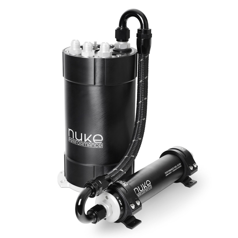 The included high-flow Nuke Performance performance fuel filter utilizes a unique 200mm 10-micron stainless steel filter element that is made out of 100% stainless steel with unique welded end caps that excludes the common glue that can dissolve when changing from petrol to ethanol or when running aggressive fuels such as race fuel. When running the over-dimensioned fuel filter from Nuke Performance, you will never have to worry about failing filter elements ever again. For more information about the 200mm fuel filter, visit the product page.