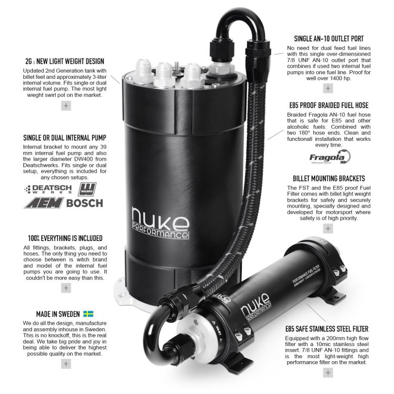 The second-generation Fuel Surge Tank Kits are developed, designed, and manufactured by Nuke Performance for the highest possible quality and with the same hallmark as all the other parts in the lightweight motorsports range. There is no substitute for the quality of Nuke Performance!