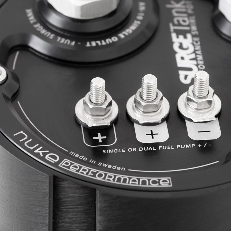 Our Fuel Surge Tank is available in several different setups, each one designed to perform to the maximum. It comes with a billet aluminum mounting bracket with a six-bolt pattern making a secure fitment in any installation. Depending on which setup you choose they come with a various number of electrical connects, but regardless of the model, it is always equipped with our over-dimensioned electrical connectors that can manage x10 the current used. The Single Outlet version is equipped with dual step connectors, letting you choose if you want to run the different fuel pumps on different steps, fuses, or at the same time.