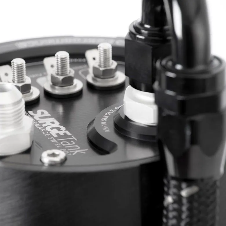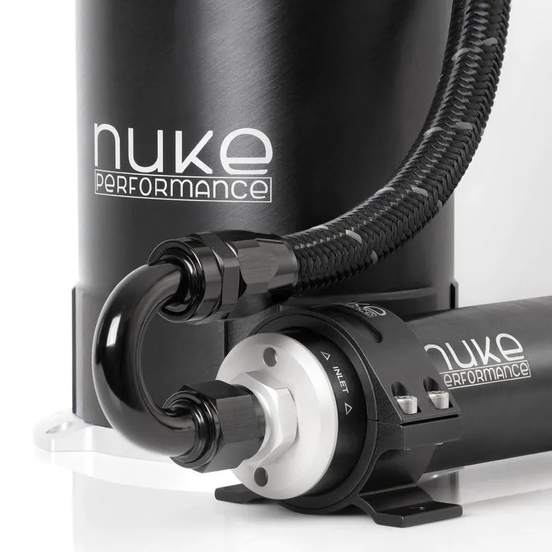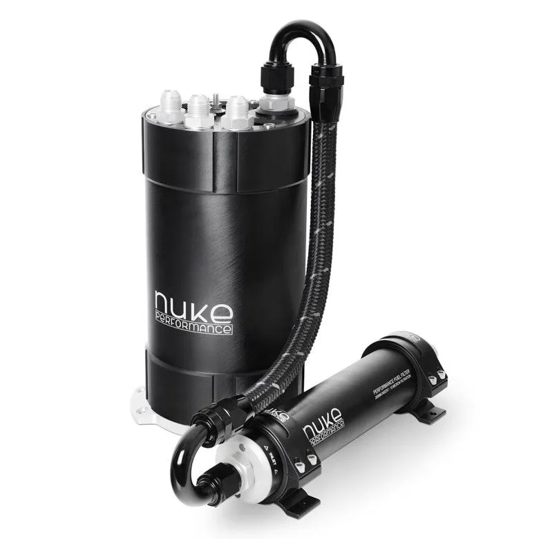 The 2nd generation Fuel Surge Tank from Nuke Performance, with everything you need to mount your fuel high-pressure fuel pumps.This new updated version is the first of its kind specially developed and designed to mount a single or dual setup of most common fuel pumps from AEM, Deatschwerks, Bosch, Aeromotive, Walbro, and more. A lightweight motorsports fuel surge tank Fits a single or dual high-pressure fuel pump 10-micron stainless steel fuel filter 3.0 liter surge tank capacity Kit with surge tank and fuel filter 100% Safe for all types of fuels Delivered with AN-10 ORB fittings This kit lets you combine two internal fuel pumps into one filtered AN-10 ORB outlet. This Fuel Surge Tank is able to deliver steady fuel flow even over 2000hp. This setup is everything you need to be combined into a space-efficient and power-efficient solution and design. Choose between a single or dual internal fuel pump setupRun one or two fuel pumps individually with multi electrical connectors on the top lid. Designed and manufactured to handle extreme amounts of power with the same hallmark as all of Nuke Performance products. Everything you need to mount a single or dual internal fuel pump is included with the Nuke Performance 2nd generation fuel surge tank kit and fits a wide selection of fuel pumps to meet your every possible need and fuel demands: 1-2 x Deatschwerks DW200 / DW300 / DW400 1-2 x AEM 320L 1-2 x Aeromotive Stealth 325 / 340 / 450 1-2 x Bosch BR540 1-2 x Ti Automotive Walbro GSS341/342 GST400/450/520 Fuel pumps are mounted with the billet internal mounting bracketThis Fuel Surge Tank comes with an internal bracket for all common 39mm fuel pumps mount with a perfect fit, it also fits the larger diameter fuel pumps such as Bosch BR540 and Deatschwerks DW400 which makes this kit suitable for all possible needs between 200 up to 2500 horsepower. High-flow fuel pumps without heavy customization of the fuel tankWith our Fuel Surge Tank, you minimize the risk when running at a low fuel level, that the system does not cope with extremely hard driving such as drifting, drag racing, and track days where you can exceed 2g, which could result in fuel loss. With this setup, you can rely on maximum fuel delivery, a safe solution for your engine and setup even when the conditions are as demanding as they get. That you are able to mount high-flow in-tank fuel pumps without extensive customization of your stock fuel tank is almost as important, this is really the only setup you need. The Fuel Surge Tank works as a buffer so the fuel pumps are always supplied with fuel for high outputs as the return line from your engine routs straight back into the FST, it stays full at all times. How to mount fuel pumps within the Nuke Fuel Surge Tank?Your stock fuel pump or your lift fuel pump within your stock fuel tank or your aftermarket fuel cell functions as a pickup fuel pump that ensures that the high-pressure fuel pumps within the oversized 3 liter surge tank always have enough fuel to maximize fuel flow and minimize the risk of starvation that can seriously harm your engine. The Fuel Surge Tank Kit is delivered with everything you need to install the fuel pumps of your selection, but we recommend adding one of our fuel pump mounting kits for optimal functionality. All fuel pumps are securely mounted in all conditions thanks to the billet fuel pump brackets. 10-micron Stainless Steel Fuel Filter with welded end-capsThe included high-flow Nuke Performance performance fuel filter utilizes a unique 200mm 10-micron stainless steel filter element that is made out of 100% stainless steel with unique welded end caps that excludes the common glue that can dissolve when changing from petrol to ethanol or when running aggressive fuels such as race fuel. When running the over-dimensioned fuel filter from Nuke Performance, you will never have to worry about failing filter elements ever again. For more information about the 200mm fuel filter, visit the product page.Performance Fuel Filter Part # : 200-03-201 Available in various setups to fill your every possible needOur Fuel Surge Tank is available in several different setups, each one designed to perform to the maximum. It comes with a billet aluminum mounting bracket with a six-bolt pattern making a secure fitment in any installation. Depending on which setup you choose they come with a various number of electrical connects, but regardless of the model, it is always equipped with our over-dimensioned electrical connectors that can manage x10 the current used. The Single Outlet version is equipped with dual step connectors, letting you choose if you want to run the different fuel pumps on different steps, fuses, or at the same time. The kit is delivered with an AN-10 fuel line and ready for AN-8 and AN-10 fittings available in many variations and sizesDelivered with a billet aluminum mounting bracket for effortless mounting. AN-10 ORB fittings for the outlet port of the fuel surge tank and the inlet port of the fuel filter are included with the kit. The outlet port of the fuel filter is AN-10 ORB, and the supply, return, and overflow ports on the surge tank are AN-8 ORB. Both AN-8 and AN-10 ORB fittings are sold as accessories and are available in a large variety of sizes and variations. Fuel Filter Outlet Fittings :AN-10 ORB to AN-6 Male Part # : 700-04-108AN-10 ORB to AN-8 Male Part # : 700-04-109AN-10 ORB to AN-10 Male Part # : 700-04-110AN-10 ORB to AN-12 Male Part # : 700-04-111 Supply, Return, and Overflow Fittings :AN-8 ORB to AN-6 Male Part # : 700-04-104AN-8 ORB to AN-8 Male Part # : 700-04-105AN-8 ORB to AN-10 Male Part # : 700-04-106 Developed with high demands from motorsportsCo-developed with worldwide motorsports teams, this fuel surge tank kit is set to perform under all conditions and for any horsepower requirements, used in all types of motorsports such as drag racing, drifting, GT racing, time attack, and more. The 2nd generation fuel surge tank kit is bor