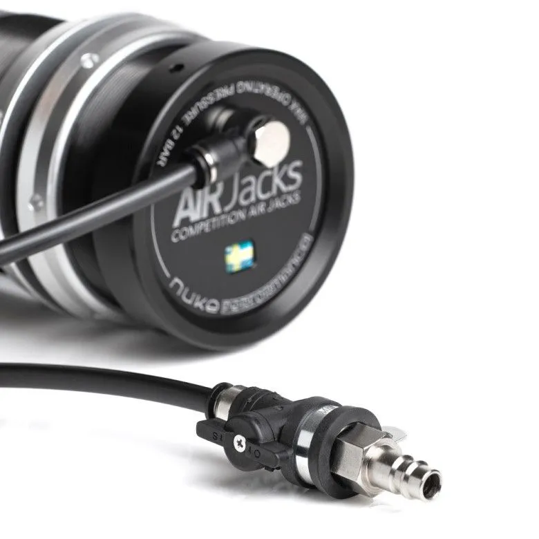 Complete set of 2pc Nuke Performance 8 BAR / 120 PSI Air Jacks 90 Competition: Fast, lightweight, reliable, and easy to use air jack kits. A product born out of the request from motorsports for an easy to use, lightweight, and reliable air jack setup that can be activated by an air supply pressure of as low as 8 BAR / 120 PSI. Lifts your vehicle to new heights by the use of a common workshop compressor. Lightweight motorsports onboard air jacks 8 BAR / 120 PSI work pressure Works with common workshop air compressors Complete set with jacks, safety props and hose kit 2pc Set lifts 804 kg / 1772 lb at as low as 8 BAR / 120 PSI Optimize your tire changes for drag racing and drifting Total lift length of 251mm / 9.88" The Nuke Performance 8 BAR (120 PSI) Air Jack 90 Competition is fast, lightweight, reliable and extremely easy to use and can be activated by an air supply pressure of as low as 8 BAR (120 PSI). Prepare yourself for anything that may go wrong during the track day and with these air jacks you are ready for fast and effective repairs so you can quickly hit the drag strip again. Made of high strength aluminum for low weight and extra durability The body is made out of high strength, machined aluminum extrusion for the thinnest possible wall thickness to achieve the lowest possible weight without sacrificing functionality. It houses a high strength aluminum piston rod with an anodized finish for long lasting durability. The internal bearings are constructed of high strength, ultradurable, low friction polyoxymethylene - these air jacks are made tough to cope with the high demands from worldwide motorsports. Works with an 8 BAR (120 PSI) common workshop air compressor The Nuke Performance Air Jack 90C has an optimal operating pressure between 6-12 BAR (87 - 174 PSI), this means that it works with a regular workshop 8 BAR (120 PSI) air compressor so you do not need to bring a huge and expensive nitrogen tank. As most workshop air compressors are available in between 8 - 12 BAR (116 - 174 PSI) this is what these air jacks are specified to work with. At as low as 8 BAR (116 PSI), these air jacks will lift 402 KG (886 LB) each, and in a 2-jack system, it results in a full 804 KG (1772 LB). This omits the need for additional equipment such as a compressed air bottle, lance, or high-pressure system. Complete set of 2 jacks for all types of motorsports use To make it as easy as possible for quick maintenance and tire changes during motorsports such as drag racing and drifting where recurring tire changes and rear end setups are required, we have put together a complete set of 2 Air Jacks with suitable accessories. The Air Jack kit contains hoses, pneufit fittings, safety props, and air jacks to cover your every need. This kit includes 2pc air jacks, intended to lift only one axle for easy access under the vehicle or for an easy and quick tire change. Nuke Performance also offers complete sets of 3 and 4pc air jacks for other configurations. Air Jack 3pc Complete Set Part # : 590-01-203 Air Jack 4pc Complete Set Part # : 590-01-204 The set comes with jacks, safety props, 5m (16.4ft) hose and fittings The Nuke Performance 90C Air Jack kits are designed to be used together with 8 BAR (120 PSI) workshop air compressors and come complete with an easy-to-use quick valve with a common EURO / pneufit fitting that fits most common air compressors. The included bracket lets you mount it in an easy to reach place out of the risk of getting it contaminated by weather or dirt from the track. In the hose kit you get 5m (16.4ft) 8mm quick connect pneufit hose, 1x quick connect T-fittings, 2x quick connect 1/4" BSPP barb fittings for the Air Jack inlets and a petcock ball valve. This kit is ideal for most setups and is easy to install, durable and affordable. How much do the Nuke Performance Air Jacks lift in a 2pc setup? The Nuke Performance Air Jacks 90 Competition is made to use with an 8 BAR / 120 PSI air compressor, and thanks to its larger diameter and clever design it can lift 402kg (886 lb) at 8 BAR (116 PSI) and 603kg (1329 lb) at 12 BAR (174 PSI) each. Combined into a setup of 2 air jacks, it is suitable when you only want to lift one end for quick setup or tire change. Perfect for drifting and drag racing. Set of 2pc at 8 BAR (116 PSI) 804KG (1772 LB) in total Set of 2pc at 12 BAR (174 PSI) 1206KG (2658 LB) in total Air Jack 90C Safety Props reduce the possibility of accidents The Nuke Performance 90 Competition Air Jack sets comes with safety props included. When working on or beneath your vehicle, there is always a possibility of accidents. When your vehicle is lifted with the help of air jacks you must always use these air jack locks or traditional jacks to prevent an accident if the pressure drops due to leakage, malfunction or handling error. The Nuke Performance 90C Safety Props simply clip securely into place when the air jack is fully extended, are equipped with an easy to use handle and come in a practical carry bag. Safety Prop Part # : 590-01-202 How do I mount Air Jacks to my vehicle? We got you covered... Made of steel and intended to be welded to the body or chassis of your build. Delivered untreated and easy to adjust to your required dimensions. If you go with the plate or bracket, we advocate the use of a lower and a higher attachment point to make the installation sufficiently durable and safe. All brackets materials and design are calculated according to what is needed, make it easy by using the Nuke Performance mounting accessories. Steel Plate Part # : 590-10-109 Steel Bracket Part # : 590-10-108 Steel Tube Part # : 590-10-110 Developed in Sweden, guaranteeing the highest possible quality The 90 Competition Air Jacks and Safety Props are developed, designed and manufactured by Nuke Performance for the highest possible quality and with the same hallmark as all the other parts in the lightweight motorsports range. There is no substitute for the quality of Nuke Performance! Ai