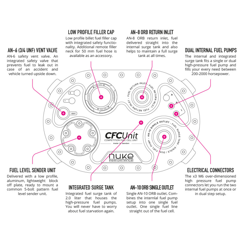 The AluCell aluminum fuel cells come delivered with the Nuke Performance CFC Unit as a fill plate replacement. The unique CFC Unit from Nuke Performance is the perfect solution for a simplified high-performance fuel system where simplicity and durability are paramount. This setup eliminates the need for a space-consuming external surge tank. With all the needed fuel pumps mounted within the fuel cell itself, this is the only thing you need. This frees up space and weight and increases safety as fewer fuel line fittings are necessary and no external fuel pumps are used.