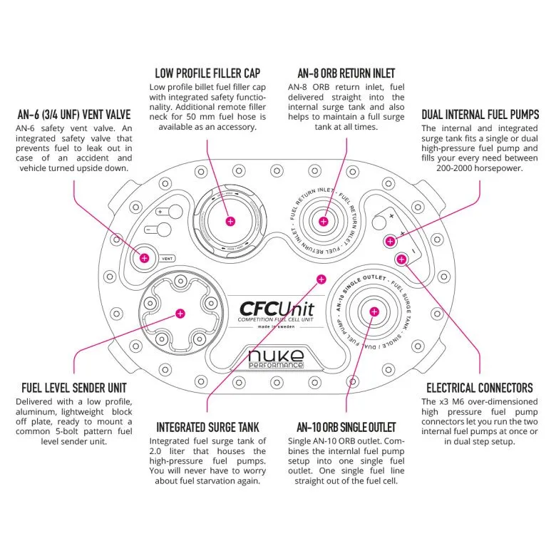 AluCell Aluminum Fuel Cells, a lightweight and affordable fuel cell combined with the Nuke Performance drop-in surge tank, the CFC Unit.This product offers an affordable solution for those who do not require FIA approval for professional racing, but still want all the benefits from the Nuke Performance CFC Unit. The drop-in fuel pump hanger with integrated surge tank provides this functionality featuring: 20 / 40 / 45WC / 60 / 80 liter aluminum fuel cell Integrated 2.0 liter Fuel Surge Tank function Safe for all types of fuels, including E85 Integrated brackets for easy and secure mounting Fits single or dual high-pressure fuel pumps A single oversized AN-10 ORB outlet, for maximal flow NEW : Available in a new 45 liter Well Cell version Low-profile fuel filler cap with integrated roll-over valve The Nuke Performance AluCell fuel cells are suitable for carburetor-based fuel systems and with the integrated CFC Unit from Nuke Performance. They eliminate the need for an external surge tank which would otherwise be needed when running a fuel cell, making it a perfect alternative for fuel-injected systems. The AluCells are made of the highest quality aluminum for use with all types of fuels and are approved for petrol, methanol, and ethanol. Integrated 2 liter surge tank, billet fuel pump hanger for 1-2 fuel pumpsThe AluCell aluminum fuel cells come delivered with the Nuke Performance CFC Unit as a fill plate replacement. The unique CFC Unit from Nuke Performance is the perfect solution for a simplified high-performance fuel system where simplicity and durability are paramount. This setup eliminates the need for a space-consuming external surge tank. With all the needed fuel pumps mounted within the fuel cell itself, this is the only thing you need. This frees up space and weight and increases safety as fewer fuel line fittings are necessary and no external fuel pumps are used. Internal high-pressure fuel pumps, for any need between 200 - 2000hpThe AluCell is delivered with the unique Nuke Performance CFC Unit with an integrated Fuel Surge Tank function and fits a single or dual high-pressure fuel pump from Deatschwerks, AEM, Ti Automotive, Walbro, Bosch, Fuelab, Aeromotive, and many more. It fits all common 39mm fuel pumps as well as the larger Deatschwerks DW400, Walbro GST450/GST520, Bosch BR540 and Aeromotive Stealth 450. Thanks to the internal surge tank, this solution is ready to deliver steady fuel flow for demands anywhere between 200-2000 horsepower without fuel starvation, even during demanding driving conditions. The CFC Unit fits the most common fuel pumps. Together with the Nuke Performance fuel pump mounting kits, it has never been this easy to set up a high-performance fuel system. How to mount fuel pumps within the AluCell fuel cell and surge tank?The single fuel pump mounted in the fuel cell functions as a pickup fuel pump that ensures that the high-pressure fuel pumps within the oversized 2 liter (0.53 gallons) surge tank always have enough fuel to maximize fuel flow and minimize the risk of starvation that can seriously harm your engine. For more information, download the product manual. The CFC Unit is delivered with everything you need to install the fuel pumps of your selection, but we recommend adding one of our fuel pump mounting kits for optimal functionality. All fuel pumps are securely mounted in all conditions thanks to the billet fuel pump brackets. Our wide variety of fittings and fitment possibilities suits your every need for fuel delivery within an aftermarket fuel systemThe Nuke Performance CFC Unit - Low profile Competition Fuel Cell Unit, with an integrated fuel surge tank, is now equipped with ORB threads instead of the UNF threads they used in the beginning. The AN-10 ORB outlet port and the AN-8 ORB return port let you choose from various available ORB fittings. The use of the oversized, high-flow AN-10 ORB outlet combines the internal fuel pumps into one single fuel line and minimizes the need for external equipment, hoses, and fittings. The included rollover-protected vent fitting is of AN-6 (3/4 UNF) and can be swapped for AN-6 to AN-10 when needed. Outlet and return AN-6, AN-8, AN-10, and AN-12 fittings are sold separately as accessories. Outlet fittings :AN-10 ORB to AN-6 Male Part # : 700-04-108AN-10 ORB to AN-8 Male Part # : 700-04-109AN-10 ORB to AN-10 Male Part # : 700-04-110AN-10 ORB to AN-12 Male Part # : 700-04-111 Return fittings :AN-8 ORB to AN-6 Male Part # : 700-04-104AN-8 ORB to AN-8 Male Part # : 700-04-105AN-8 ORB to AN-10 Male Part # : 700-04-106AN-8 ORB to AN-12 Male Part # : 700-04-107 NEW : The Fuel Cell Vent Kit AN-6 fits straight to the vent valve of the CFC Unit for easy installationThe CFC Unit is equipped with a roll-over protected AN-8 (3/4 UNF) to AN-6 Male vent fitting, and the easiest way to route the vent line into a safe and functional position is to accommodate a fuel cell vent kit from Nuke Performance. Available in several sizes, from AN-6 to AN-12, you can choose the kit that suits your needs the best. If you want to use a larger vent line than AN-6, you also need to swap the fitting on the vent valve. The vent kit is delivered with a 1m (3.3ft) nitrile fuel hose and a universal air filter that prevents debris to get into your fuel system. Aluminum lightweight 20 / 40 / 45 / 60 / 80-liter fuel cell with integrated bracketsTo enable the highest possible quality, the AluCells are made out of two pieces of aluminum and are automatically welded by a 5-axis welding robot. Each one is individually pressure tested before surface treatment to ensure maximal functionality and CE marking requirements specifications. With the use of high corrosion resistance aluminum (5083 H111), it does not need any internal anodizing or powder coating that gets affected by alcoholic fuels such as ethanol. This prevents damage to your injectors and filters when the coating dissolves. Some color shading can occur on the inside of the fuel cell 